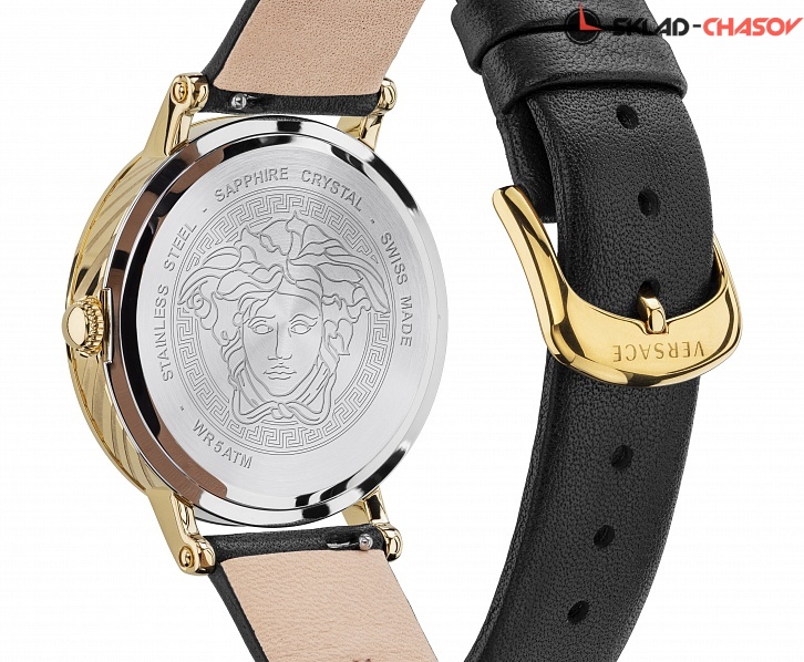 Современный дизайн и узнаваемый фирменный стиль Versace - эти очаровательные часы достойны восхищения. Medusa Chain. Циферблат обрамлен узором в виде цепочки. В положении 12-ти часов на циферблате - фирменный декор в виде головы Медузы. Рифленая заводная головка. Кожаный ремешок с лазерной гравировкой Barocco V.