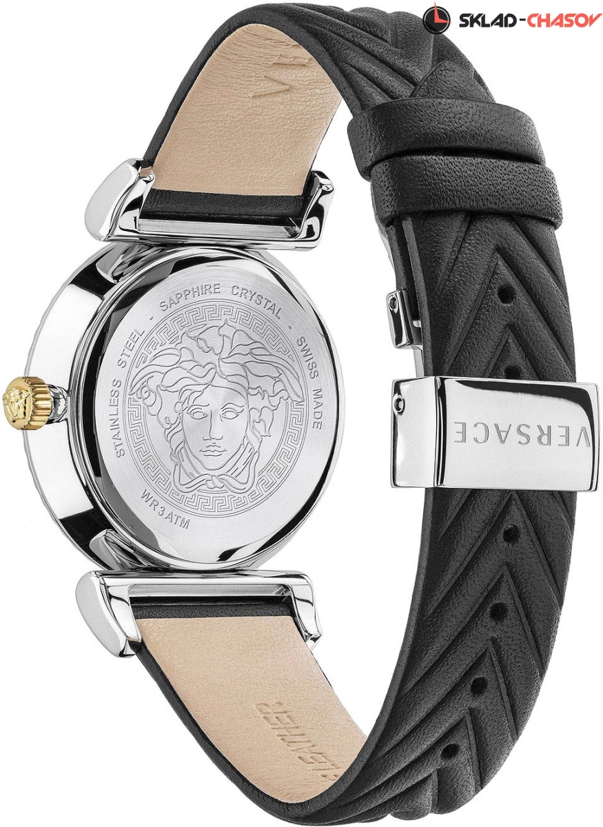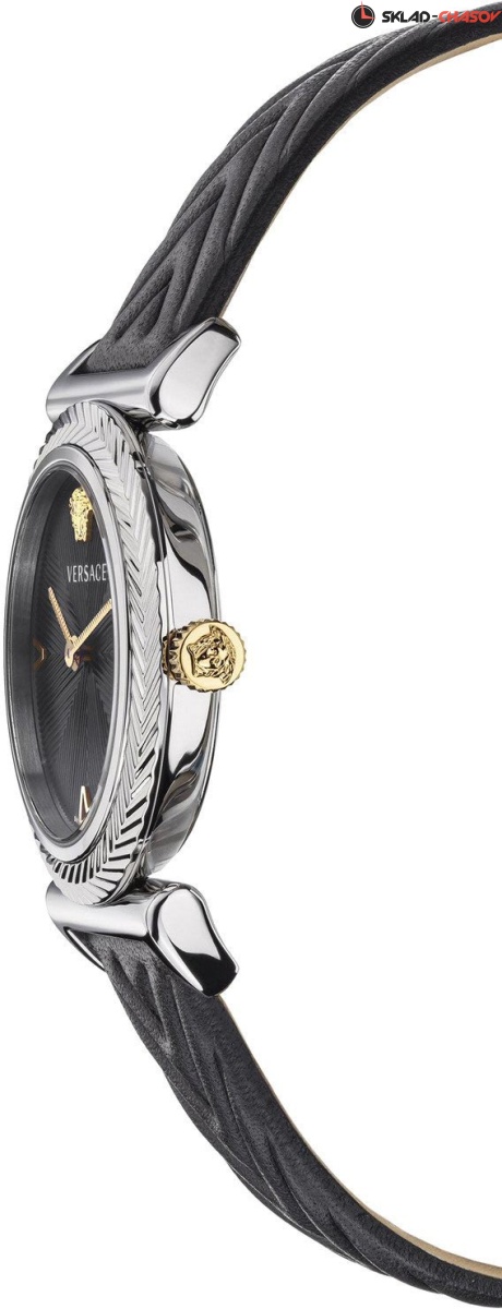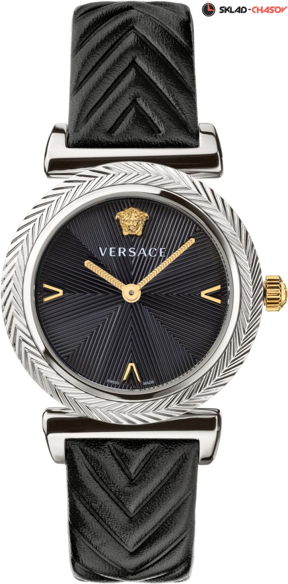 Быть стильной легко, когда ваше запястье украшают эти модные дизайнерские часы. Стильные женские часы V-Motif Vintage. Круглый стальной корпус. Золотистая голова Медузы на отметке 12 часов. Метки в виде штрихов V-образной формы. Безель, циферблат, стрелки и ремешок выполнены с фирменным мотивом буквы ''V'', что придает этим часам индивидуальность, подчеркивая винтажный стиль. Рифленая заводная головка украшена рельефным изображением головы Медузы. Задняя крышка украшена гравировкой головой Медузы. Кожаный ремешок с раскладывающейся застежкой.
