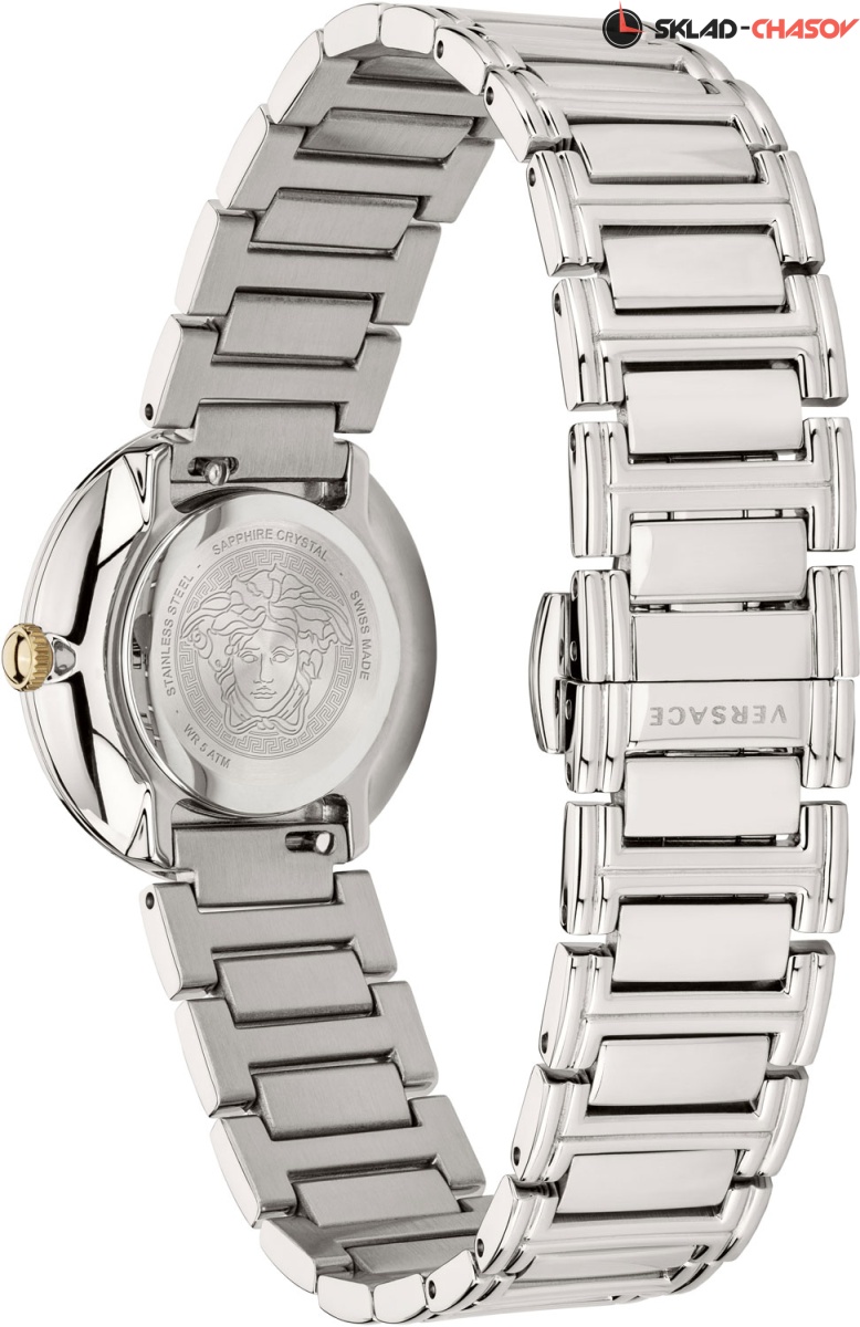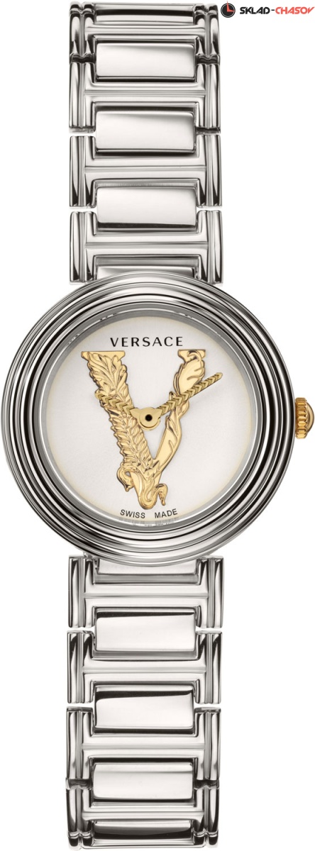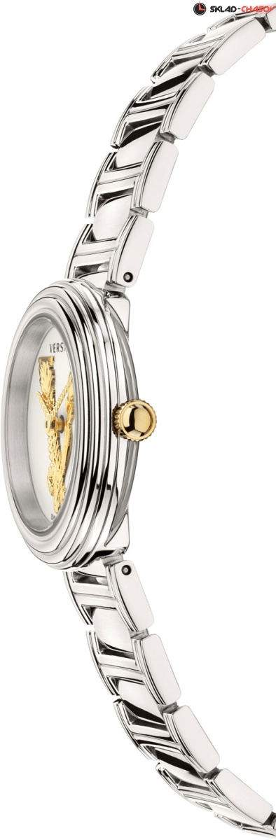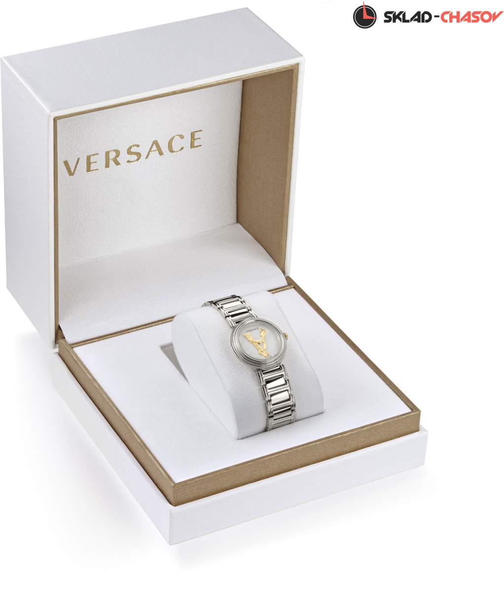 Роскошные небольшие женские часики, сочетающие в себе простоту и шик, индивидуальность и нежность линий. Virtus Mini. Круглый стальной полированный корпус с выразительным трехуровневым безелем. Циферблат украшен объемной, декорированной узором в виде оливковых ветвей, буквой ''V''. Стрелки украшены орнаментом с паттерном в виде буквы ''V''. Метки отсутствуют. Рифленая заводная головка. Задняя крышка украшена выгравированным фирменным логотипом в виде головы Медузы, окруженной меандровым орнаментом Greca. Стальной браслет с раскладывающейся застежкой.