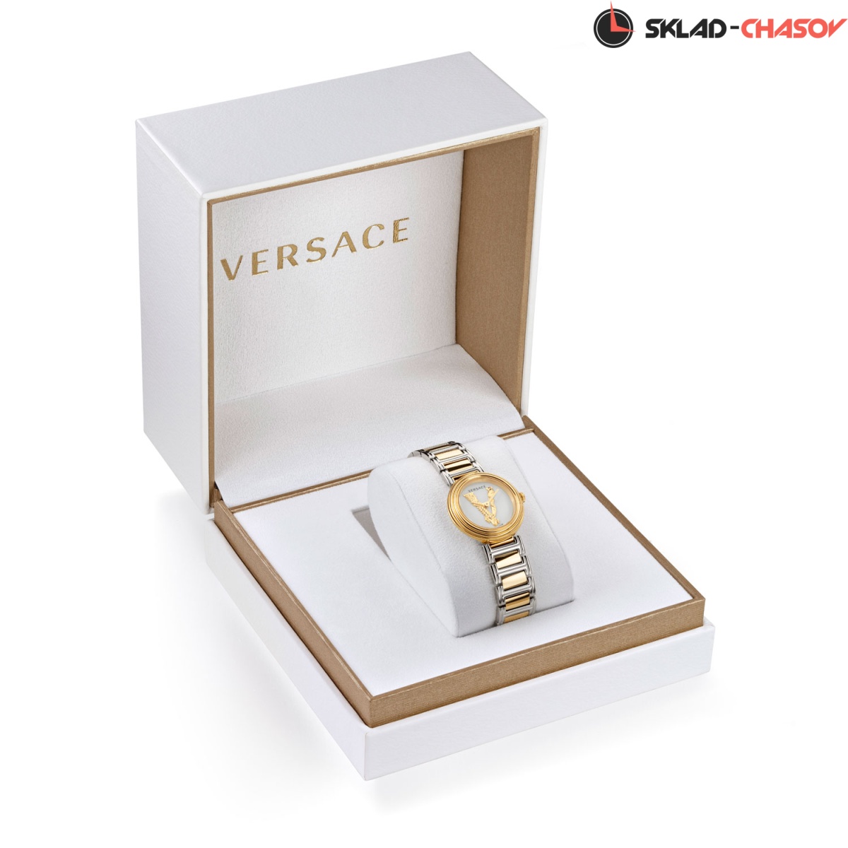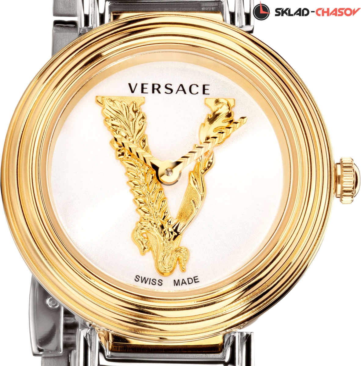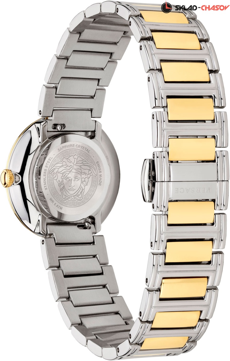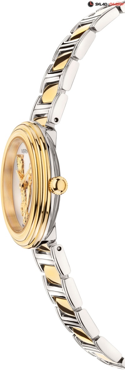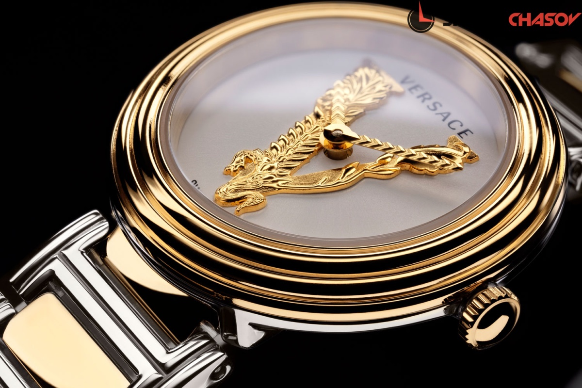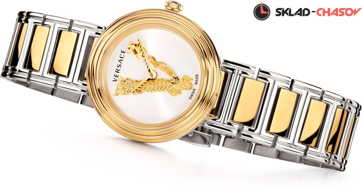 Роскошные небольшие женские часики, сочетающие в себе простоту и шик, индивидуальность и нежность линий. Virtus Mini 28mm. Круглый стальной полированный корпус с выразительным трехуровневым безелем. Циферблат украшен объемной, декорированной узором в виде оливковых ветвей, буквой ''V''. Стрелки украшены орнаментом с паттерном в виде буквы ''V''. Метки отсутствуют. Рифленая заводная головка. Задняя крышка украшена выгравированным фирменным логотипом в виде головы Медузы, окруженной меандровым орнаментом Greca. Стальной браслет с раскладывающейся застежкой.