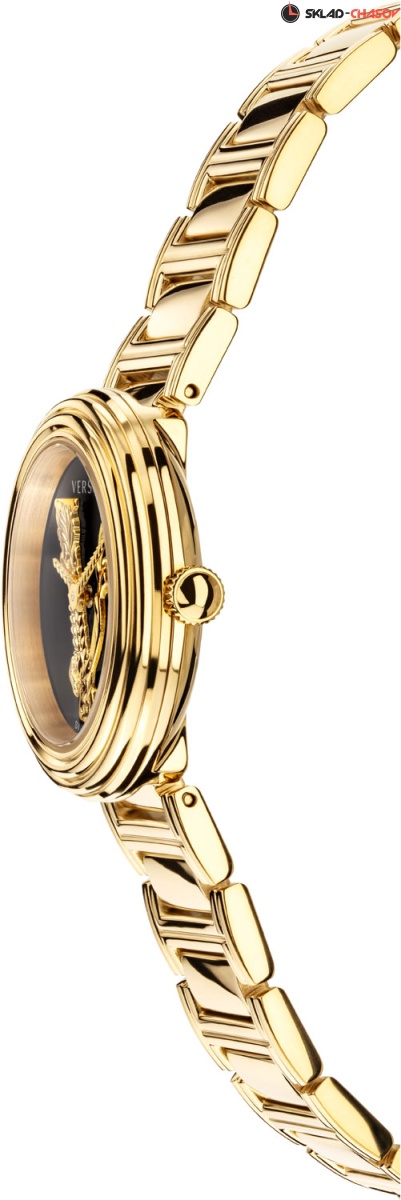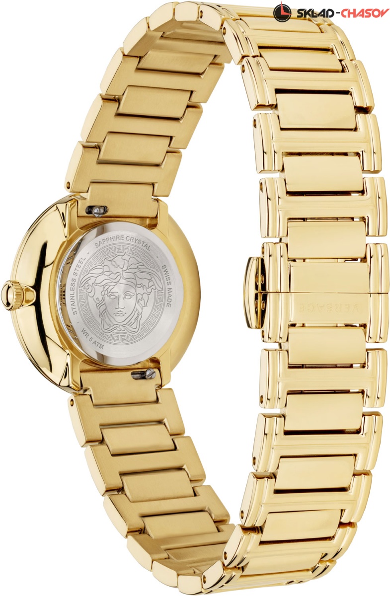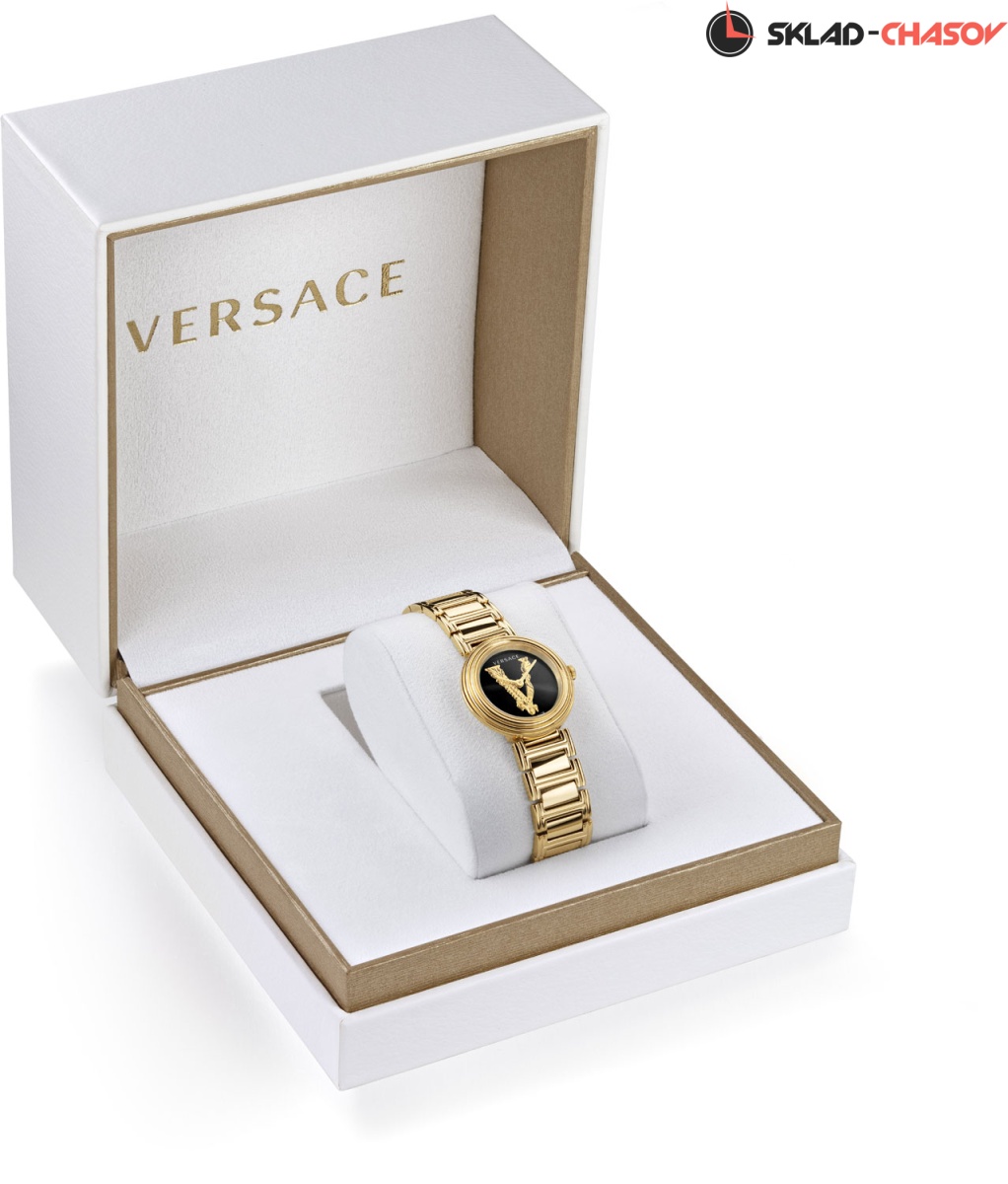 Роскошные небольшие женские часики, сочетающие в себе простоту и шик, индивидуальность и нежность линий. Virtus Mini. Круглый стальной полированный корпус с выразительным трехуровневым безелем. Циферблат выполнен по технологии Sunray (солнечные лучи) и украшен объемной, декорированной узором в виде оливковых ветвей, буквой ''V''. Стрелки украшены орнаментом с паттерном в виде буквы ''V''. Метки отсутствуют. Рифленая заводная головка. Задняя крышка украшена выгравированным фирменным логотипом в виде головы Медузы, окруженной меандровым орнаментом Greca. Стальной браслет с раскладывающейся застежкой.