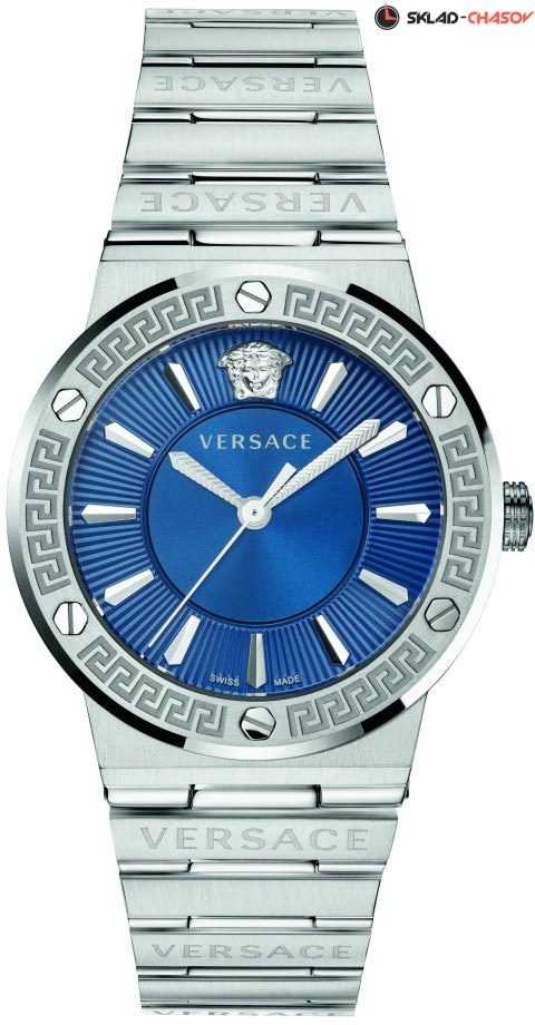 Изящный дизайн женских часиков, непременно, очарует каждую, кто бросит взор на этот шедевр часового искусства. Greca Logo. Циферблат с метками в виде штрихов. Метка на 12 часов выполнена в виде головы Медузы. Безель украшен гравировкой с меандровым мотивом. Рифленая заводная головка. Завинчивающаяся задняя крышка. Браслет с раскладывающейся застежкой.