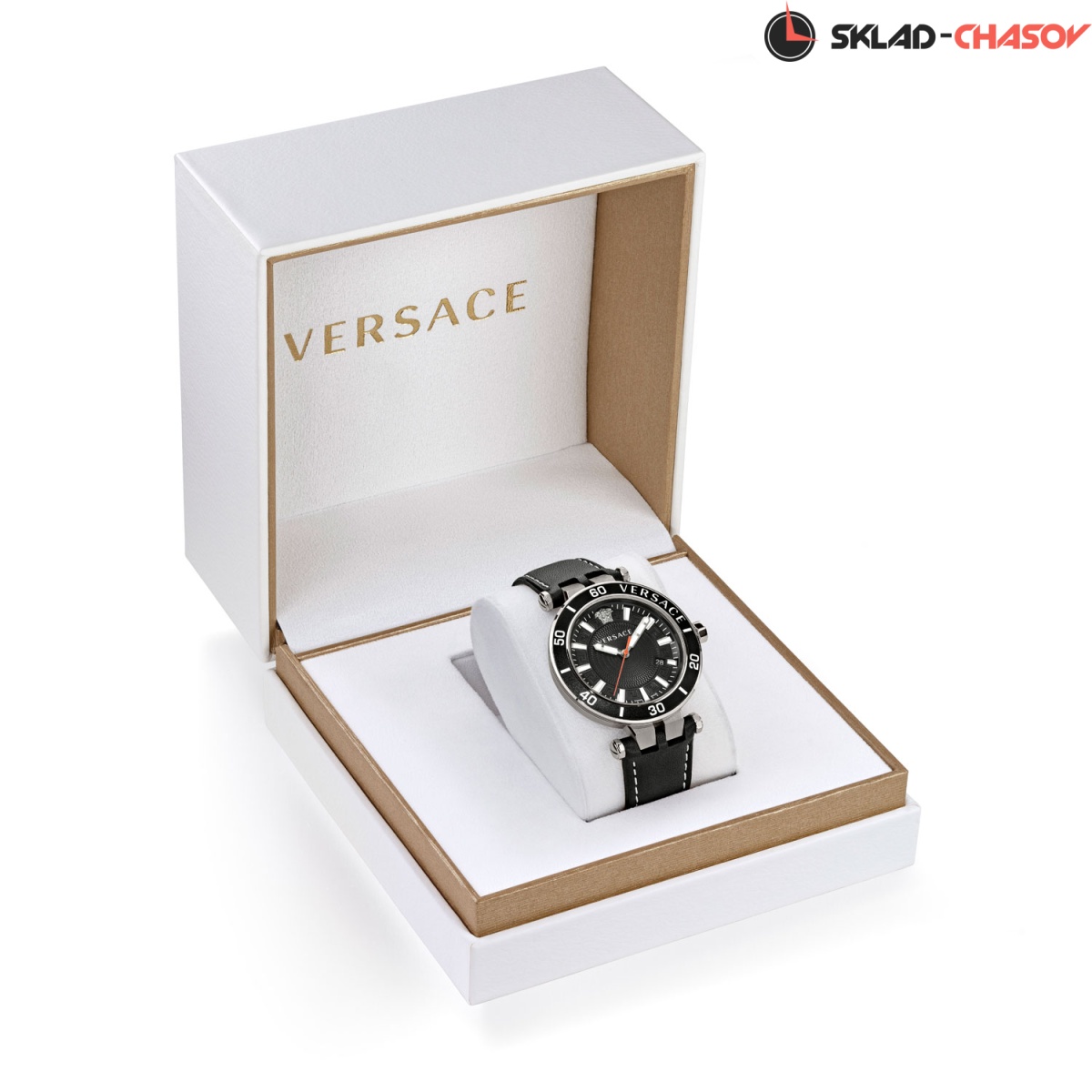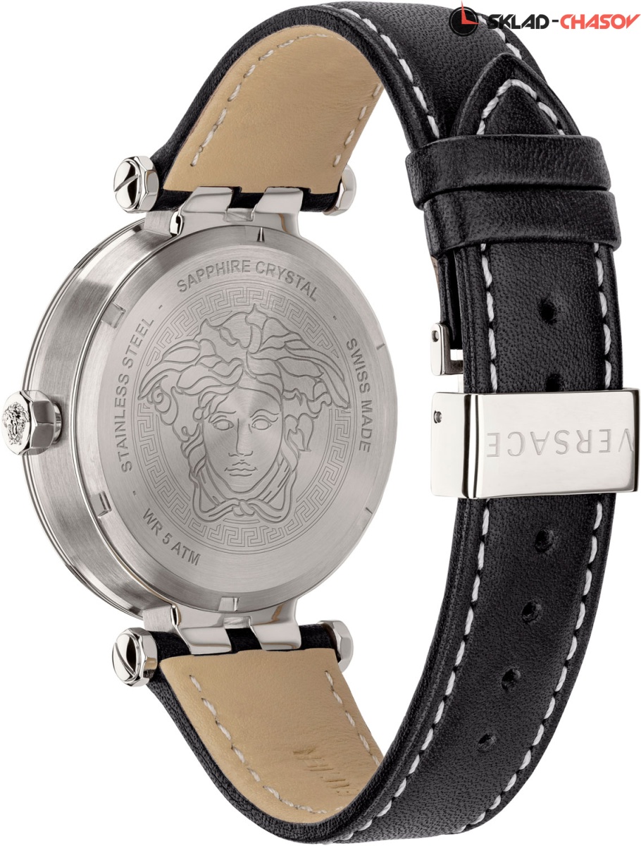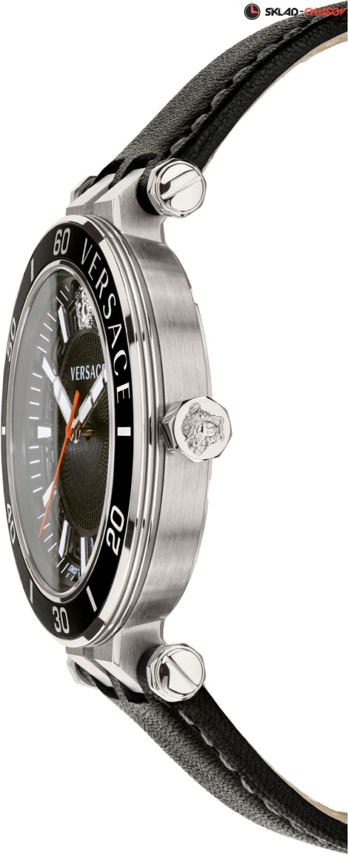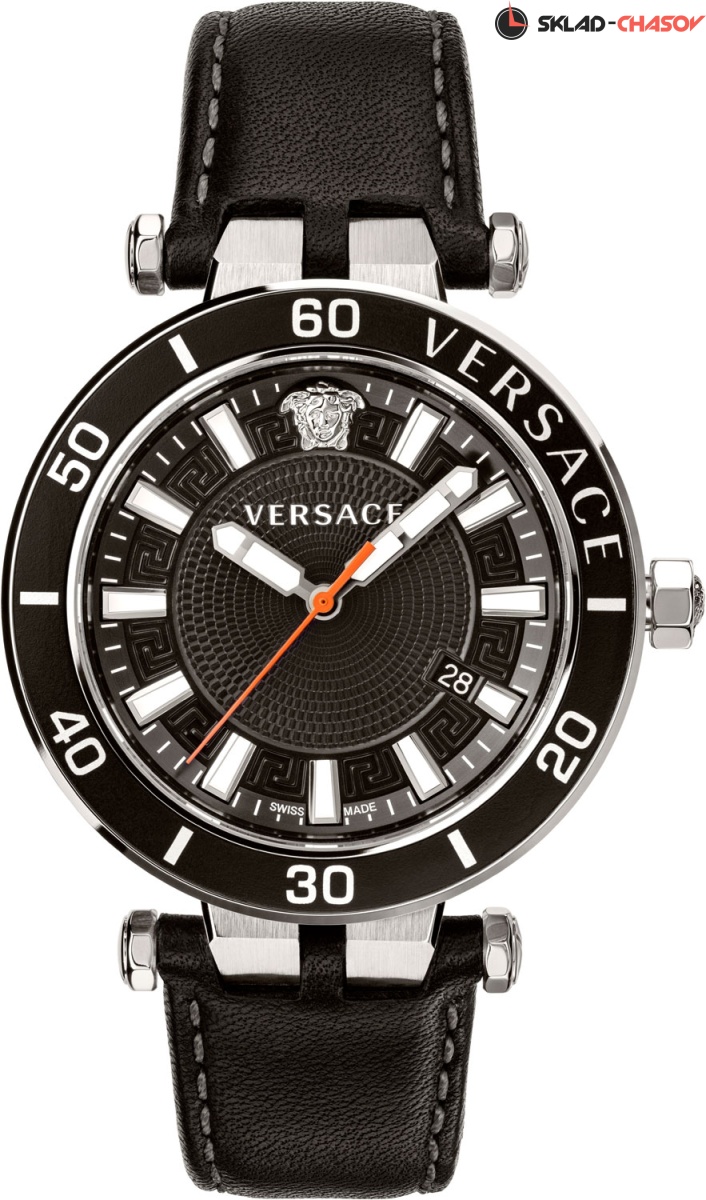 Модный спортивный дизайн, швейцарское качество и удобный кожаный ремешок - эти часы сумеют вас покорить. Greca Sport 43 mm. Круглый стальной корпус. Безель с секундной шкалой и надписью ''Versace''. Циферблат украшен декоративными узорами. Метки в виде штрихов. Окошко даты находится в положении 4 часа. Циферблат, восьмигранная заводная головка и завинчивающаяся задняя крышка украшены фирменным логотипом в виде головы Медузы. Ремешок из натуральной кожи с раскладывающейся застежкой и системой быстрой замены.