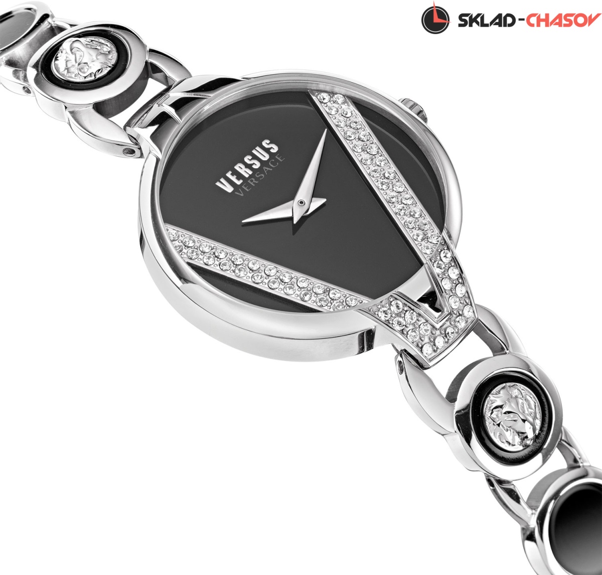 Необыкновенной красоты дизайн этих женских кварцевых часов с легкостью впишется в любой ваш наряд. С этими часами вы будете всегда в центре внимания. Saint Germain Petite. Круглый полированный корпус часов из нержавеющей стали и циферблат украшены единой фирменной буквой ''V'', усыпанной кристаллами Swarovski. Ромбовидные стрелки. Метки отсутствуют, в положении 12 часов расположен фирменный логотип. Рифленая заводная головка. Звенья стального браслета украшены вставками с объемными логотипами в форме головы льва.