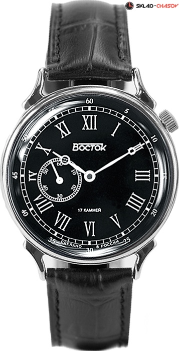 Мужские механические наручные часы Восток в классическом исполнении. Сердцем часов выступает механизм с ручным заводом "Восток 2403" калибра 24 мм (частота 19800 полуколебаний/час). Продолжительность хода от полной заводки пружины - 38 часов. Секундная стрелка вынесена на отдельный малый циферблат. Заводная головка смещена. Циферблат закрывает выпуклое органическое стекло. Корпус выполнен из часовой латуни с покрытием хромом. Задняя крышка выполнена из нержавеющей стали и декорирована гербом России. Ремешок из натуральной кожи с классической застежкой.