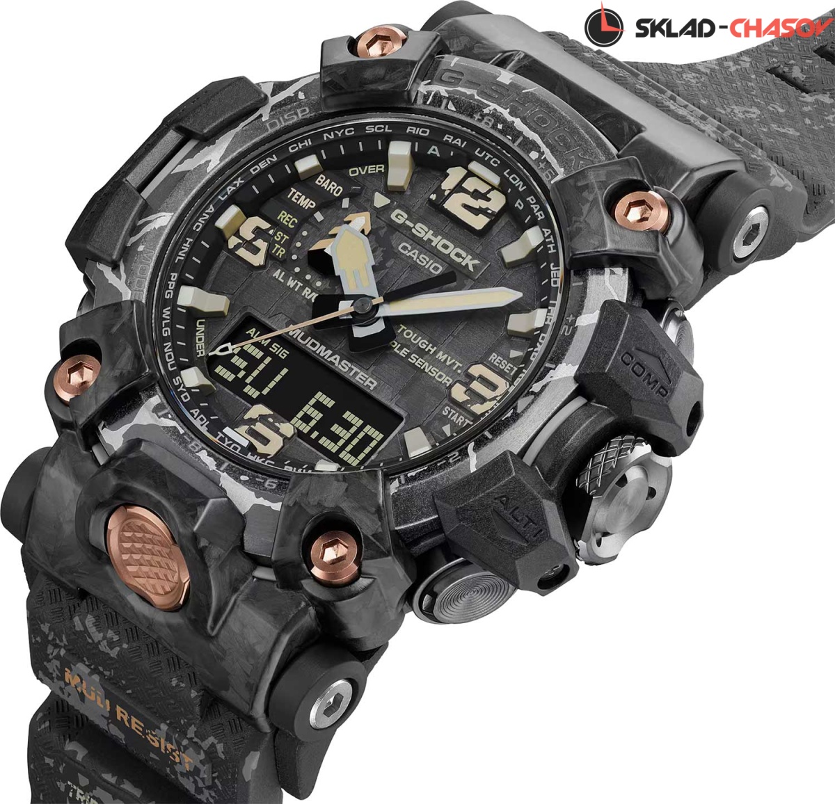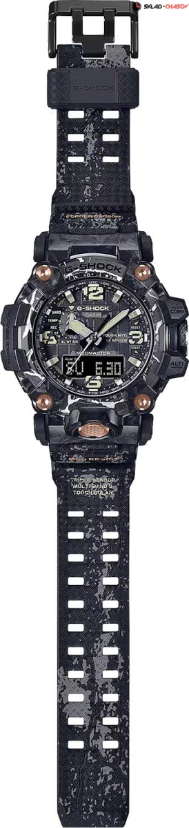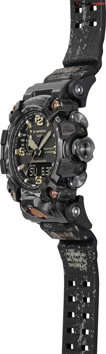 G-Shock Mudmaster. Часы спроектированы и разработаны специально для работы в суровых условиях. Питание от солнечной энергии Tough Solar - солнечные батарейки большой мощности, индикатор заряда батареи. Время работы аккумулятора без подзарядки до 6 месяцев, при включенной функции сохранения энергии до 25 месяцев. Технология Carbon Core Guard. Противоударный пластиковый корпус с карбоновыми волокнами более прочный и, в то же время, более легкий. Этот же материал защищает внутренний модуль от повреждений и деформаций при ударах. Защита от попадания внутрь пыли и грязи. Модуль часов рассчитан на работу при низких температурах до -10°С/14°F. Двойная подcветка: циферблат и ЖК-дисплеи подсвечиваются светодиодом, благодаря наличию функции задержки, после отпускания кнопки освещение горит еще несколько секунд. Настраиваемое послесвечение 1,5 или 3сек. Цвет подсветки: белый. Необритовое светонакопительное покрытие обеспечивает длительное послесвечение в темноте даже после кратковременного нахождения на свету. 12-ти и 24-х часовой формат времени. Секундомер с точностью показаний 1/100с и временем измерения 24ч. SPLIT-хронограф. Таймер обратного отсчета времени от 1с до 1ч. Мировое время – 29 городов (29 часовых поясов), всемирное координированное время (UTC). Функция включения/отключения летнего времени. Переключение между домашним и мировым временем. Высотомер - встроенный датчик барометрического давления с возможностью вывода результатов в единицах высоты над уровнем моря (от -700 до 10000 метров), единица измерения 1м. График набора высоты. Хранение до 30 записей о высотных точках рельефа местности - измеренной абсолютной высоты, даты и времени. Барометр - измерение атмосферного давления от 260 до 1100 гПа (от 195 до 825 мм рт. ст.). Встроенный датчик температуры от -10° до +60°С с точностью 0,1°C. Технология Multi Band 6 позволяет принимать сигналы от шести радиовышек, расположенных в различных точках земного шара, которые передают временные сигналы от определенных атомных часов. Коррекция текущего времени радиосигналом почти по всему миру: Англия, Германия, США, Япония и Китай. Функция автоматической коррекции положения стрелок проверяет положение стрелок каждый час и корректирует его в случае необходимости. Цифровой компас. Диапазон измерения от 0° до 359° с точностью 1°. Двунаправленная калибровка и коррекция магнитного склонения. Система Smart Access с помощью заводной головки обеспечивает простой и удобный доступ ко всем важным функциям часов. Нажатие или поворот заводной головки позволяет переключаться между различными режимами и активировать будильник, таймер, секундомер, а также настраивать функцию мирового времени. Блокировка заводной головки. Функции перемещения стрелок для беспрепятственного просмотра информации на цифровом дисплее и отключения/включения звука. Завинчивающаяся заводная головка с защитой. Ремешок с классической застежкой.