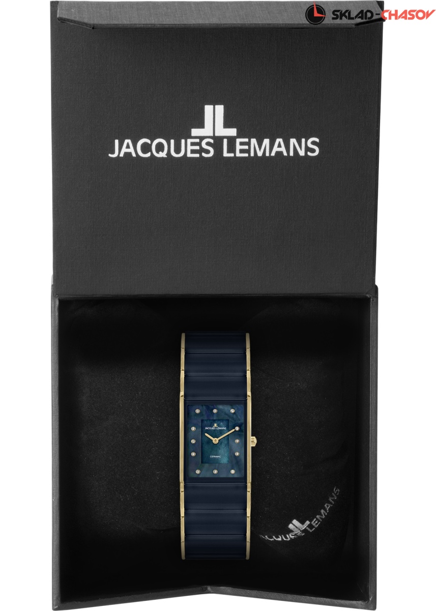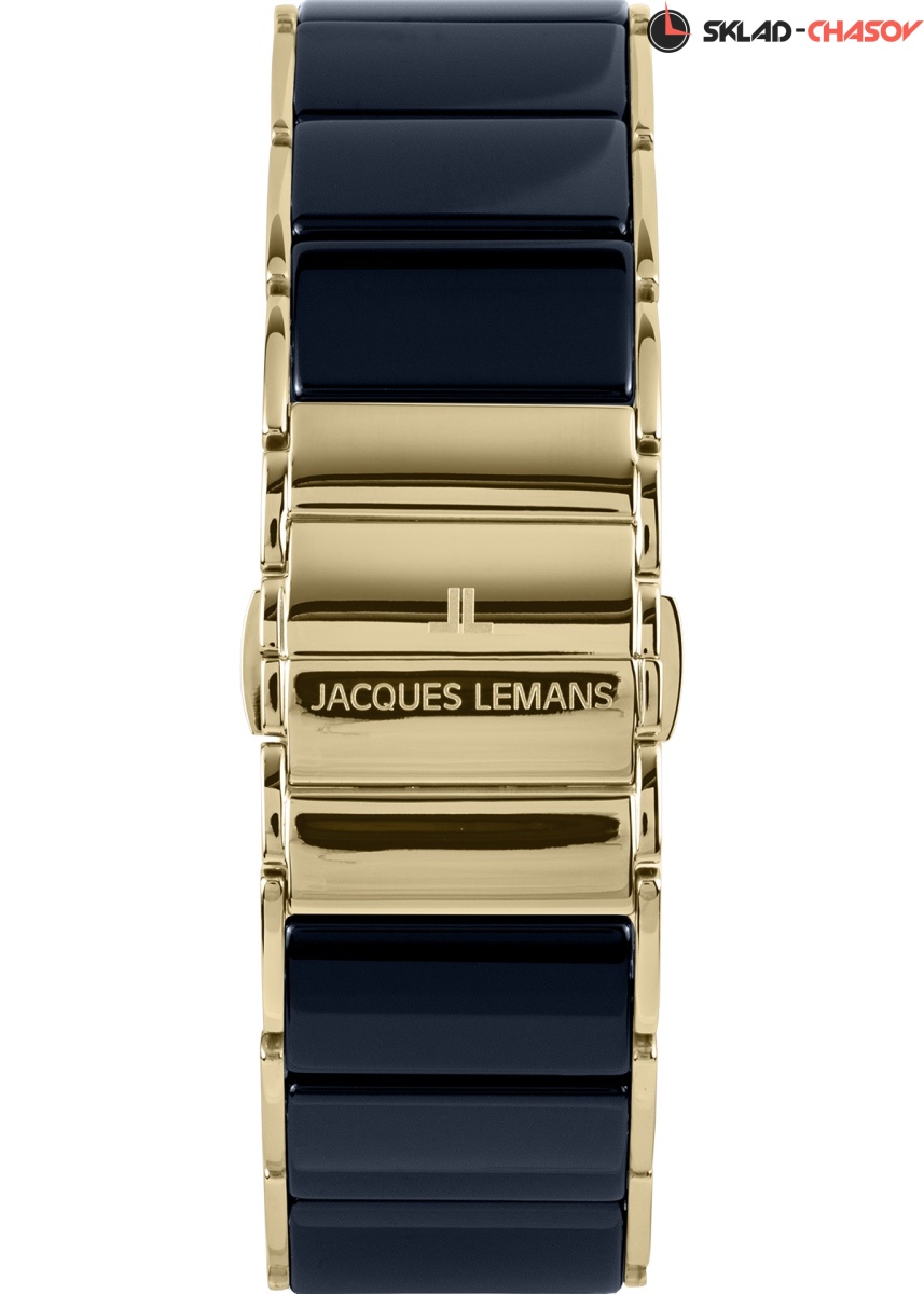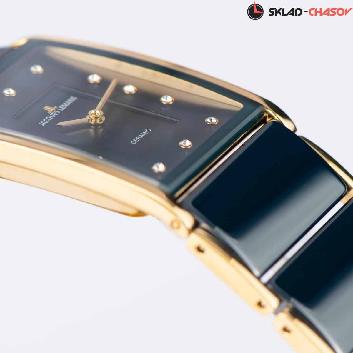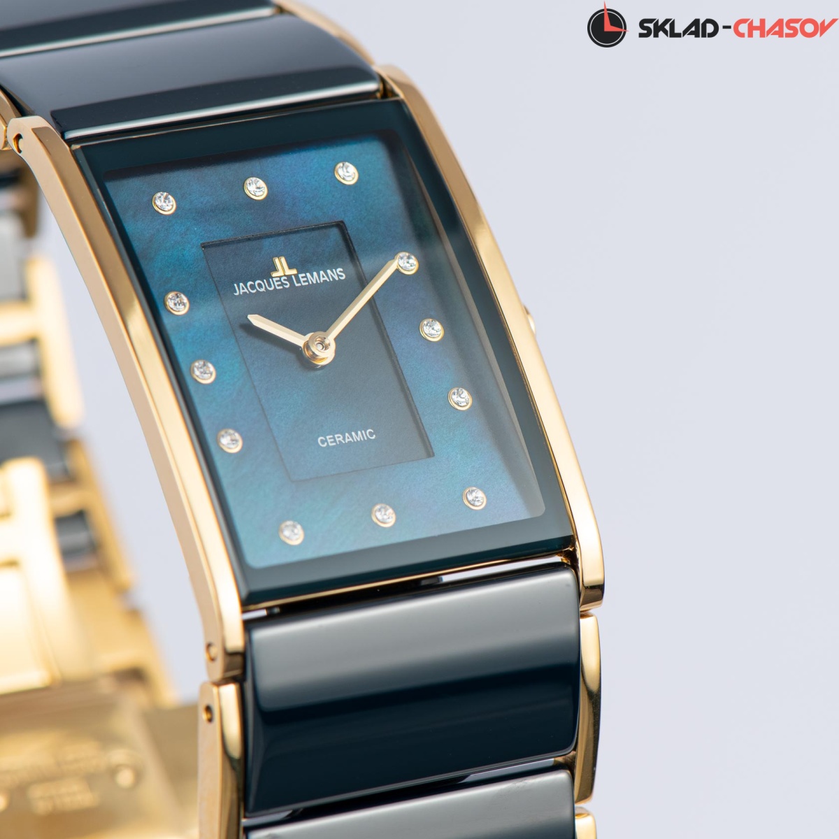 Элегантные и статусные часы с кварцевым механизмом. Их прямоугольный корпус из нержавеющей стали с PVD-покрытием из желтого золота плавно перетекает в браслет, звенья которого сделаны из высокотехнологичной керамики белого цвета. На модели установлена удобная в использовании застежка-клипса, ее механизм раскрытия приводится в действие двумя кнопками, расположенными по бокам. Двухуровневый синий циферблат часов сделан из натурального перламутра. Оттенок этого природного материала способен меняться в зависимости от освещения. В качестве маркеров дизайнеры Jacques Lemans используют кристаллы Swarovski. Циферблат надежно защищен минеральным стеклом с сапфировым напылением.