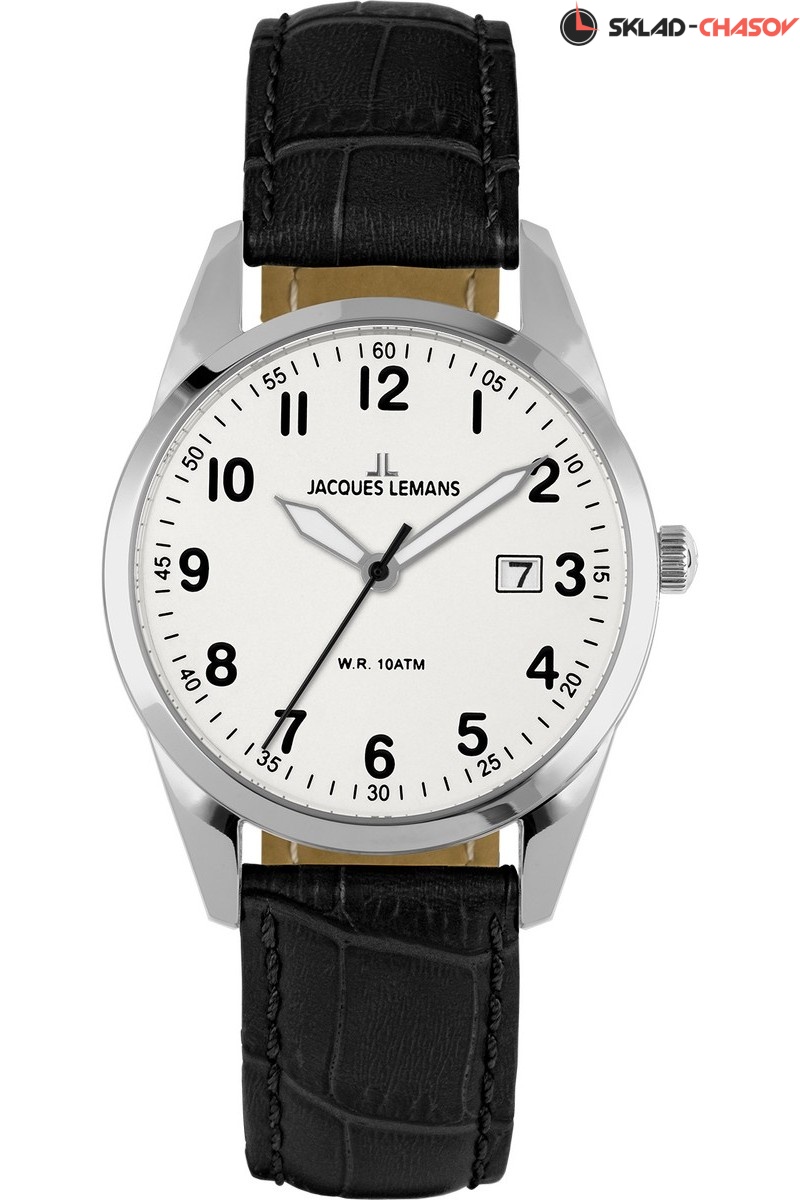 Удобные и функциональные часы созданы Jacques Lemans для женского запястья. Корпус из нержавеющей стали диаметром 30 мм обрамляет белый циферблат с крупными стрелками, хорошо читаемыми арабскими цифрами и индикатором даты в положении «3 часа». В этих кварцевых часах установлены ударопрочное минеральное стекло Crystex и завинчивающаяся задняя крышка. Водостойкость составляет 10 атм. Завершает образ ремешок из натуральной кожи черного цвета с прошивкой. Часы, выполненные в классических традициях, будут модными независимо от течения времени.