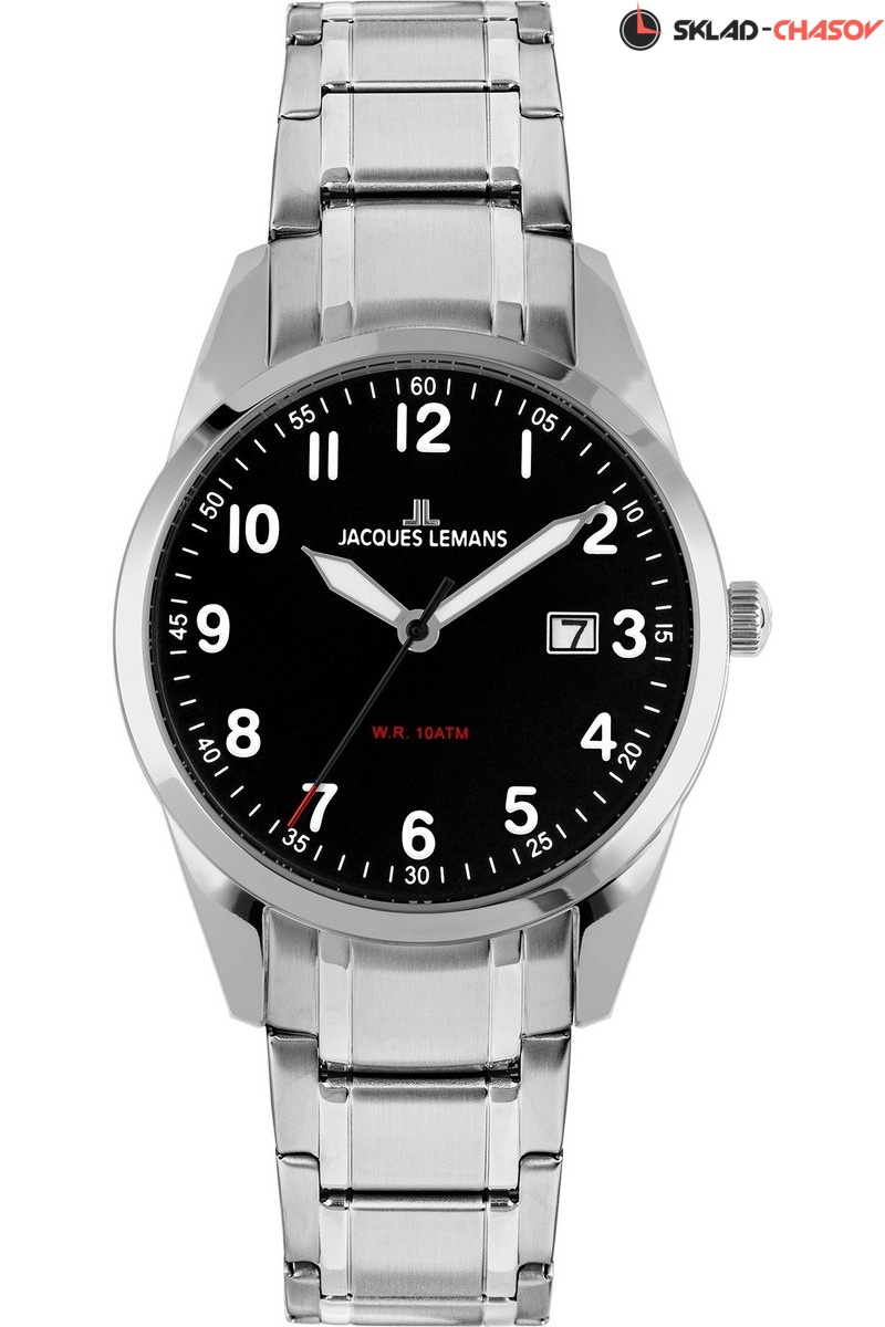 Удобные и функциональные часы созданы Jacques Lemans для женского запястья. Корпус из нержавеющей стали диаметром 30 мм обрамляет черный циферблат с крупными стрелками, хорошо читаемыми арабскими цифрами и индикатором даты в положении «3 часа». В этих кварцевых часах установлены ударопрочное минеральное стекло Crystex и завинчивающаяся задняя крышка. Водостойкость составляет 10 атм. Завершает образ браслет из нержавеющей стали, в котором эффектно чередуются зеркальная полировка и матирование. Часы, выполненные в классических традициях, будут модными независимо от течения времени.