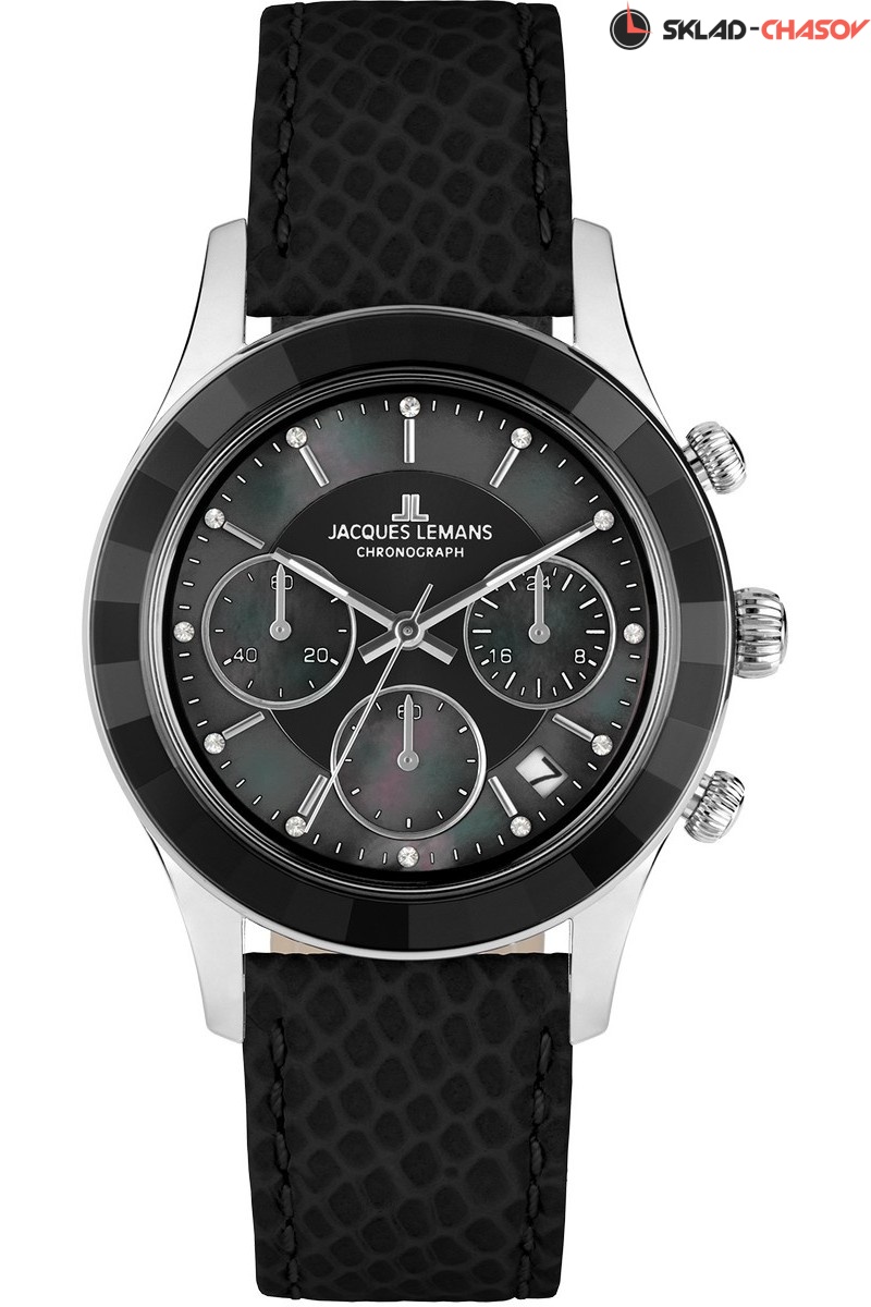Спортивный характер хронографа Venice в 38-миллиметровом корпусе из нержавеющей стали и на ремешке из натуральной кожи черного цвета с объемным тиснением смягчает пластина из натурального перламутра, закрепленная на черном циферблате модели. Ее переливы привлекают внимание к трем дополнительным индикаторам (минутный, секундный накопитель, 24 часа) и окошку даты.