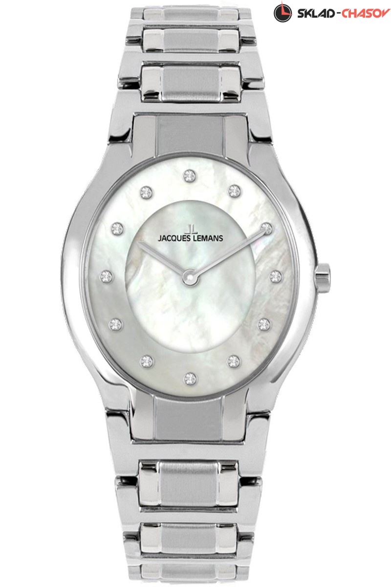 Внутри тонкого корпуса из нержавеющей стали работает механизм Ronda: он показывает время с помощью изящных стрелок часов и минут. Белый циферблат состоит из двух уровней, оба выполнены из натурального перламутра. В роли маркеров часов выступают кристаллы Swarovski, каждый в индивидуальной рамке. Защищает циферблат минеральное стекло с сапфировым напылением. Водостойкость модели 5 атмосфер. Браслет из нержавеющей стали украшает чередование зеркальной полировки и матирования. Раскладывающаяся застежка надежно удерживает аксессуар на запястье. Элегантные и утонченные, часы серии 1-2155 будут уместны в любой ситуации и дополнят как повседневный, так и вечерний образы.