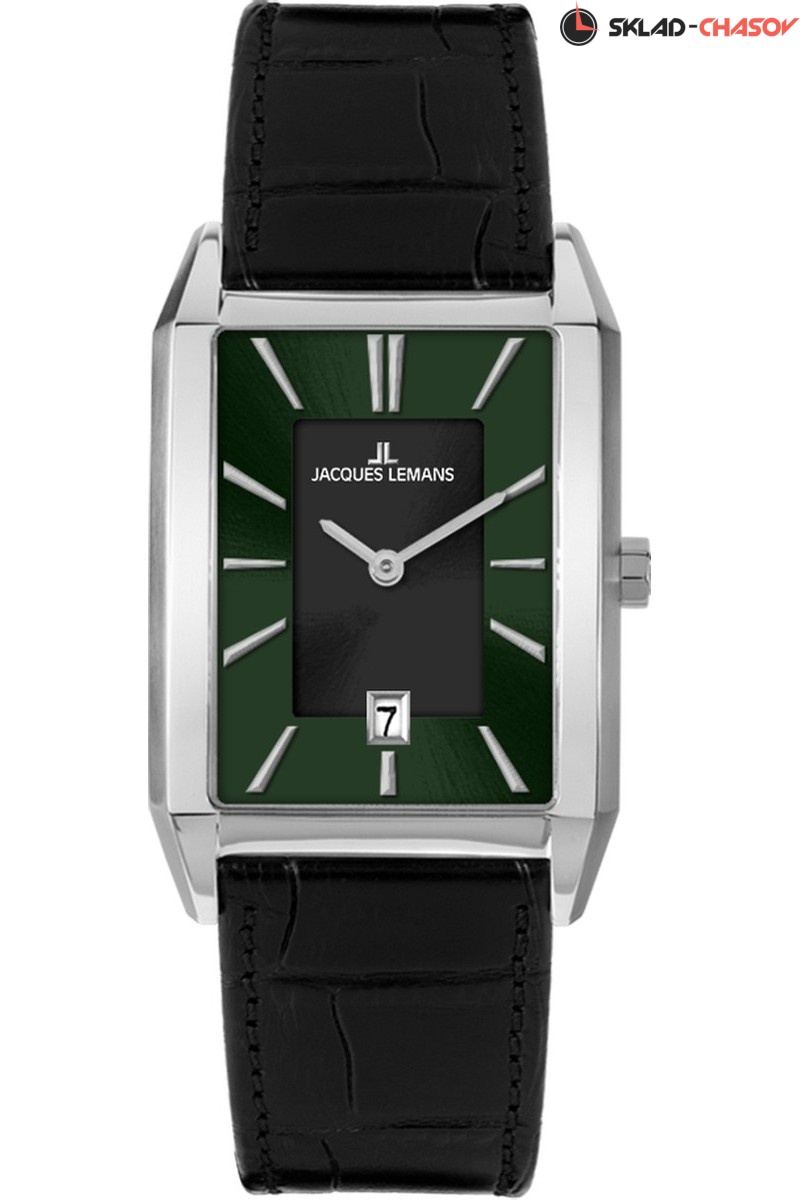 Серия 1-2159 включает классические часы, которые вы будете с удовольствием надевать каждый день. Удобный корпус (30х46 мм) в форме стильного прямоугольника сделан из гипоаллергенной нержавеющей стали, материала, который способен сопротивляться появлению микроцарапин. Минеральное стекло с сапфировым напылением защищает двухуровневый циферблат с комбинацией черного и темно-зеленого цветов. Точно определить время помогут хорошо читаемые риски и стрелки. На 6 часах расположено окошко даты с накладной рамкой. Ремешок сделан из натуральной кожи черного цвета, застежка-пряжка украшена логотипом бренда Jacques Lemansбренда Jacques Lemans.