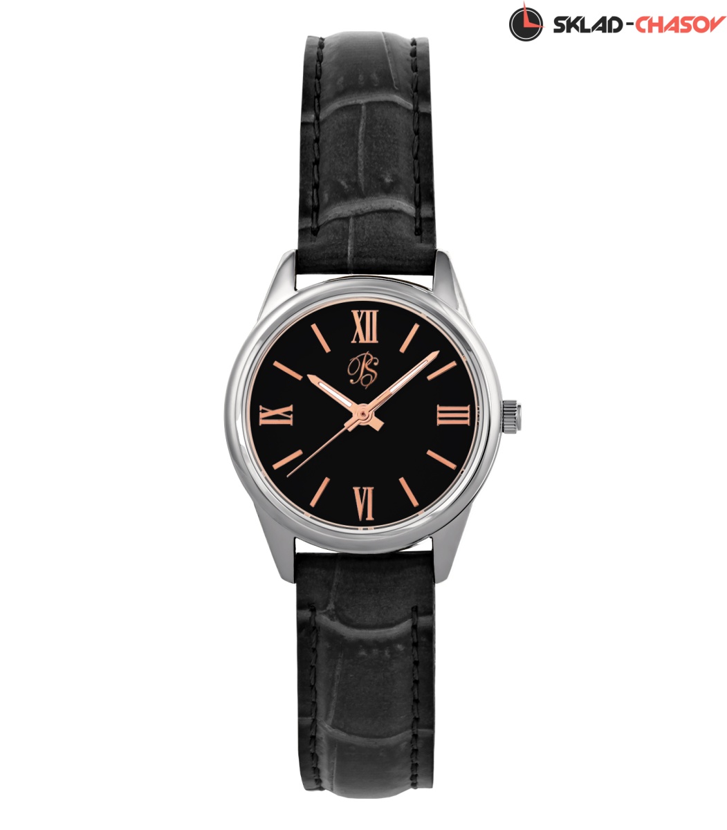 Механизм часов электронно-механический кварцевый. Показания: часы, минуты, секунды. Циферблат черного цвета с частичной римской оцифровкой цвета розового золота. Стрелки часов цвета розового золота; часовая и минутные стрелки с белым светонакопительным заполнением.