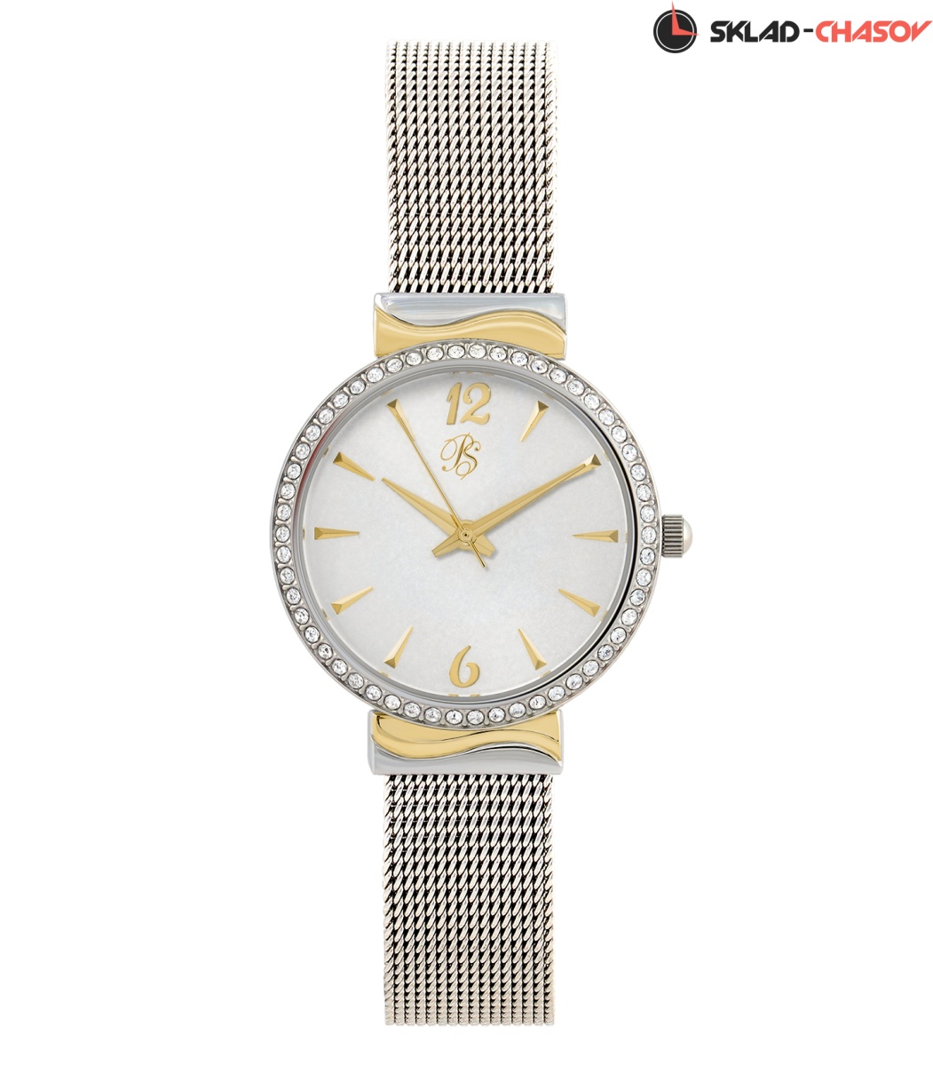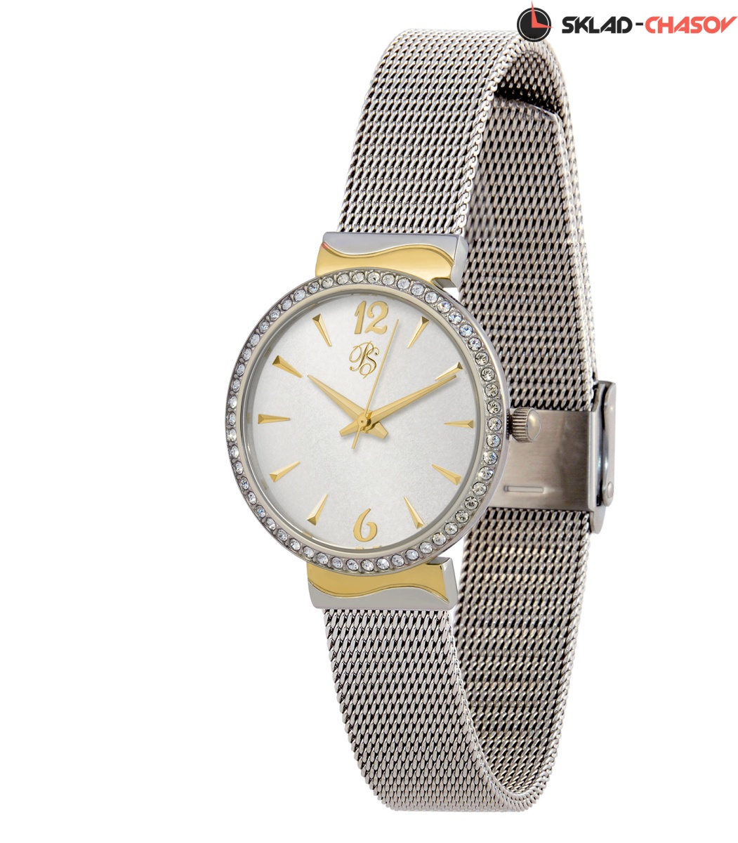 Кожаный ремень крепится к корпусу часов через переходное звено с биколорным покрытием. Лаконичный циферблат со строгими часовыми индексами венчает безель корпуса, полностью украшенный стразами.