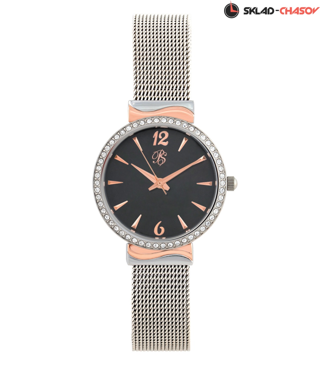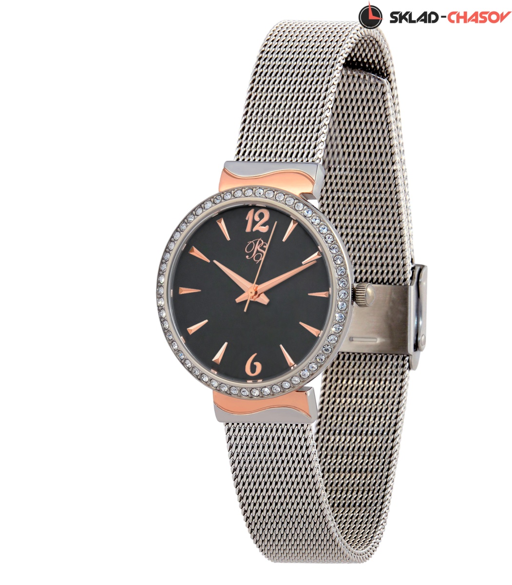 Стальной браслет крепится к корпусу часов через переходное звено с биколорным покрытием. Лаконичный циферблат со строгими часовыми индексами венчает безель корпуса, полностью украшенный стразами.