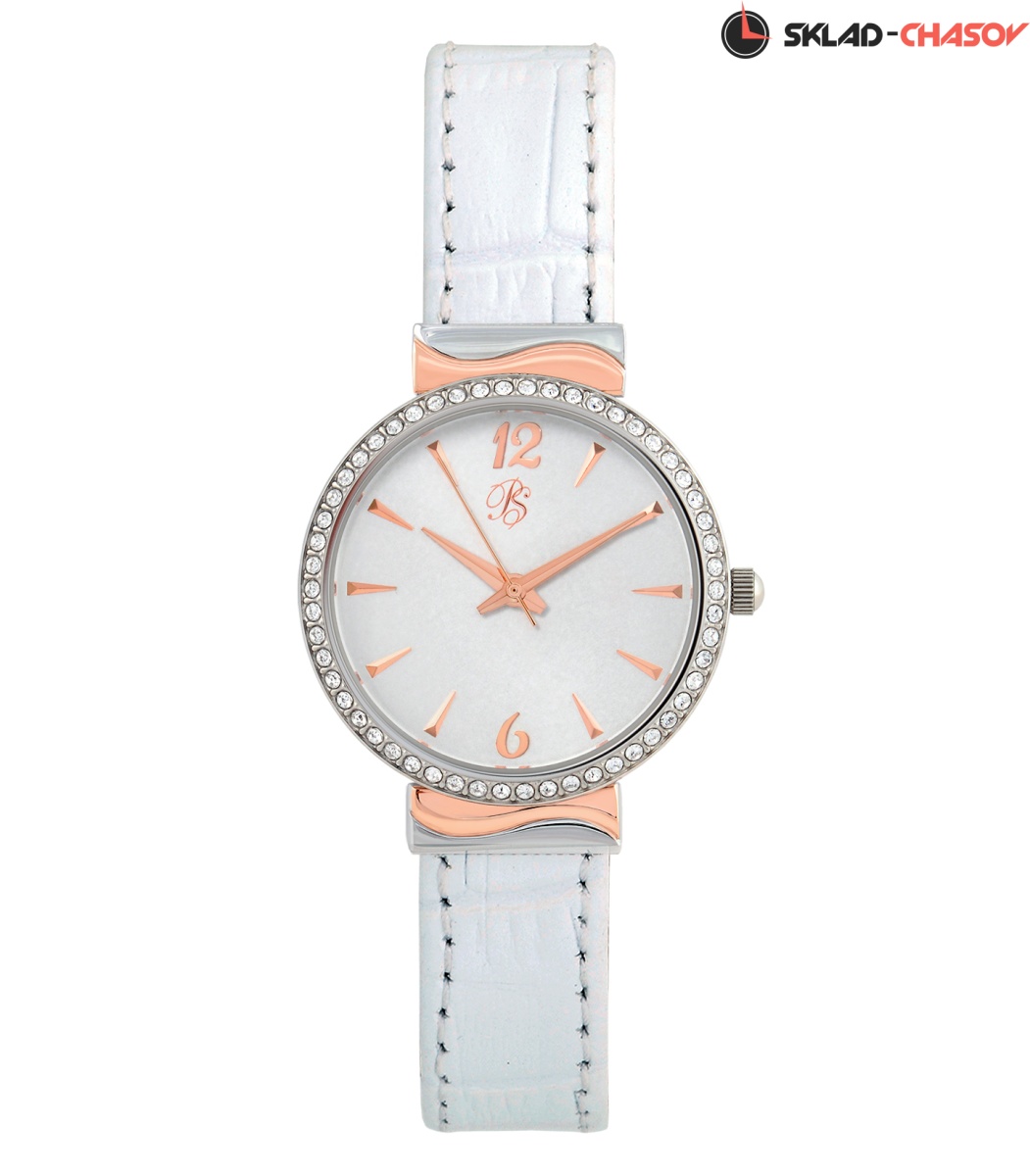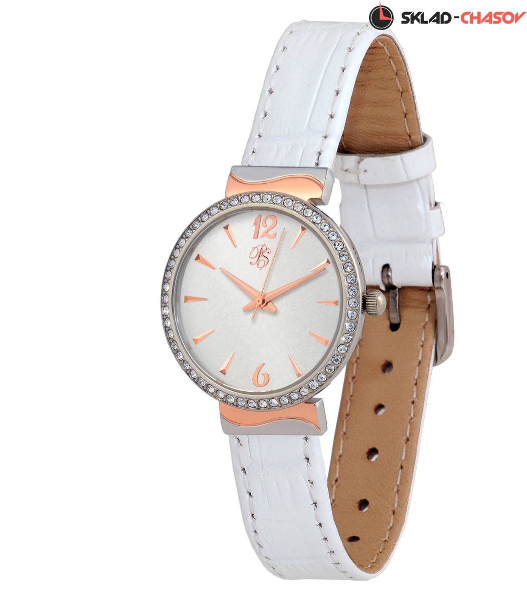 Кожаный ремень в тон циферблата крепится к корпусу часов через переходное звено с биколорным покрытием. Лаконичный циферблат со строгими часовыми индексами венчает безель корпуса, полностью украшенный стразами.