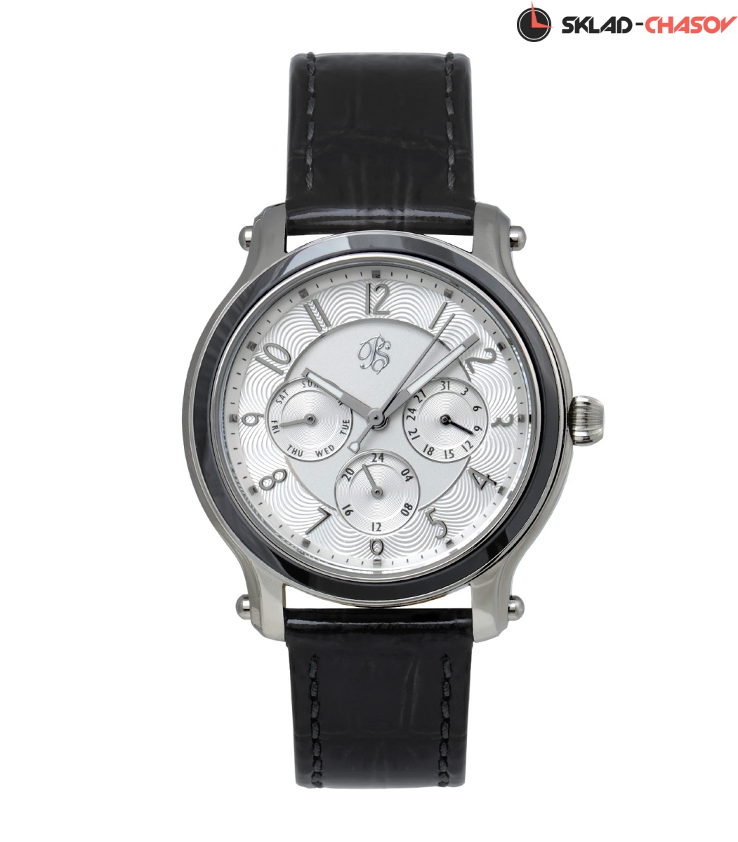 Бело-серебристый циферблат под знаками декорирован узором из тонких линий, что создает впечатление объемного, живого рисунка.
