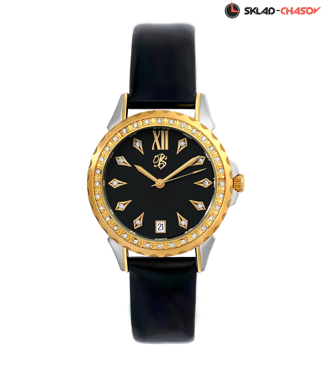 Чёрный циферблат с накладными индексами и стразами Swarovski.