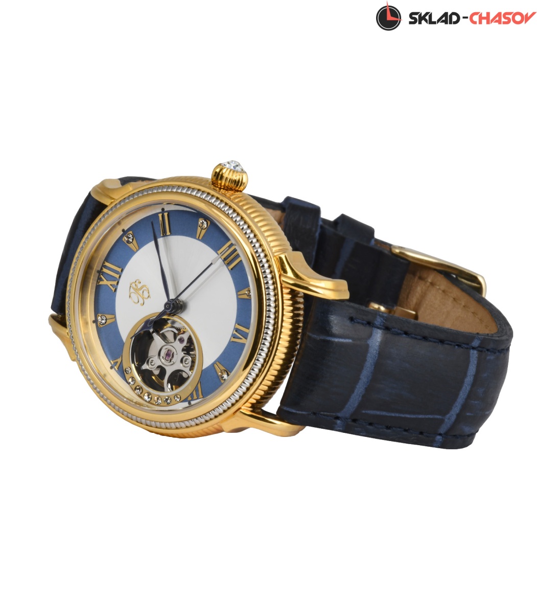 Циферблат защищает минеральное стекло. Для оформления циферблата используются вставки из фианитов. Через отверстие в циферблате видна работа баланса часового механизма.