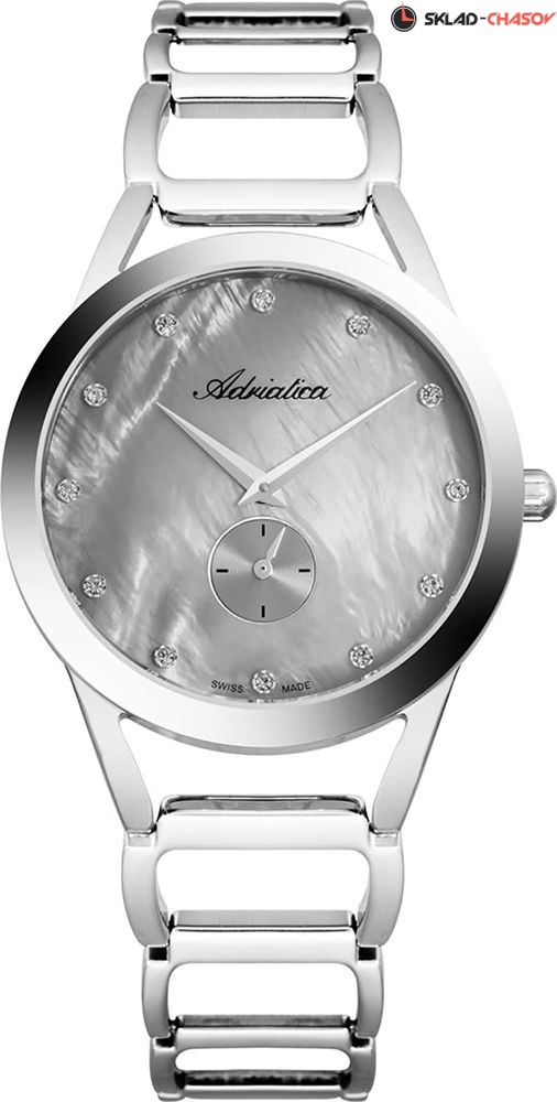 Классические женские часы Adriatica на стальном браслете. Перламутровый циферблат украшен 12 фианитами, расположенными на местах часовых меток. Секундная стрелка вынесена на отдельный циферблат. Точность хода обеспечивает швейцарский кварцевый механизм ETA 902.Гарантия 2 года.