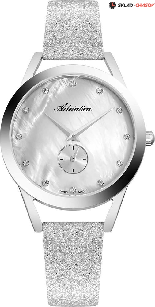 Классические женские часы Adriatica на кожаном ремешке. Перламутровый циферблат украшен 12 фианитами, расположенными на местах часовых меток. Секундная стрелка вынесена на отдельный циферблат. Точность хода обеспечивает швейцарский кварцевый механизм ETA 902. Вес часов 50 грамм. Гарантия 2 года.