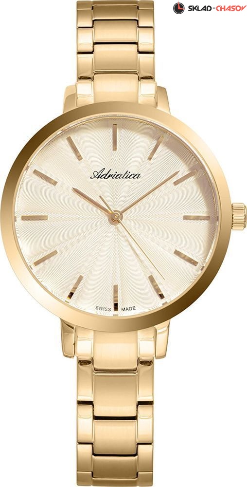 Женские наручные часы Adriatica в золотом исполнении. Точность хода обеспечивает швейцарский кварцевый механизм Ronda 763. Браслет из нержавеющей стали с раскладывающейся застежкой. Гарантия 2 года.