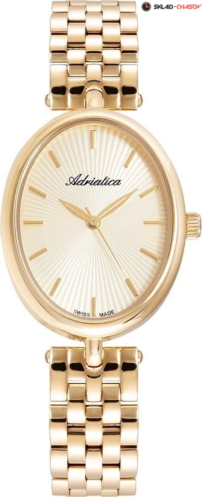 Эта уникальная модель от Adriatica придаст женскому стилю неповторимый характер. Часы сочетают в себе точность кварцевого механизма, высокое качество материалов и интересный дизайн. Корпус и браслет, выдержанные в оттенке золотого цвета, были отлиты из нержавеющей стали, демонстрируя устойчивость к погодным условиям и коррозии. Золотистый циферблат защищен минеральным стеклом. Часы устойчивы к небольшим случайным брызгам и имеют 2-летнюю гарантию производителя. Небольшой вес в 55 грамм придает часам легкости и комфортности при ежедневном ношении.Гарантия 2 года.