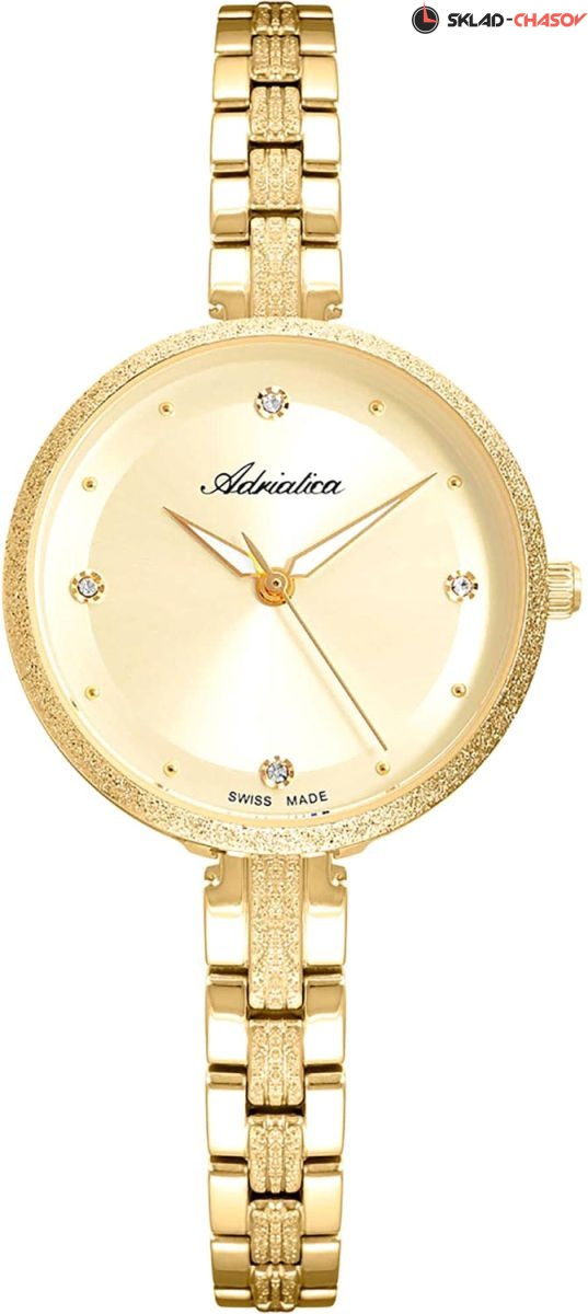 Стильная модель женских часов на браслете от Adriatica. Циферблат украшен 4 цирконами. Точность хода обеспечивает швейцарский кварцевый механизм Ronda. Гарантия 2 года.
