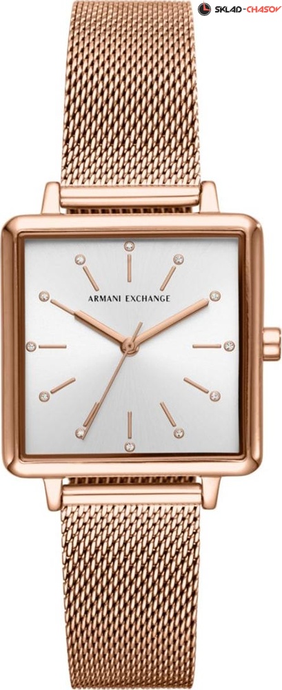 Стильные женские часы Armani Exchange в квадратном корпусе. Циферблат украшен кристаллами. Браслет выполнен в технике миланского плетения. Гарантия 2 года.