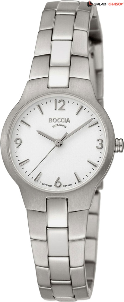 Стильные женские часы Boccia на браслете. Точность хода обеспечивает японский кварцевый механизм Miyota. Браслет с раскладывающейся застежкой. Обхват запястья от 150 до 200 мм. Гарантия 2 года. Комплектация: Часы, фирменная упаковка, инструкция на русском языке, заполненный гарантийный талон.