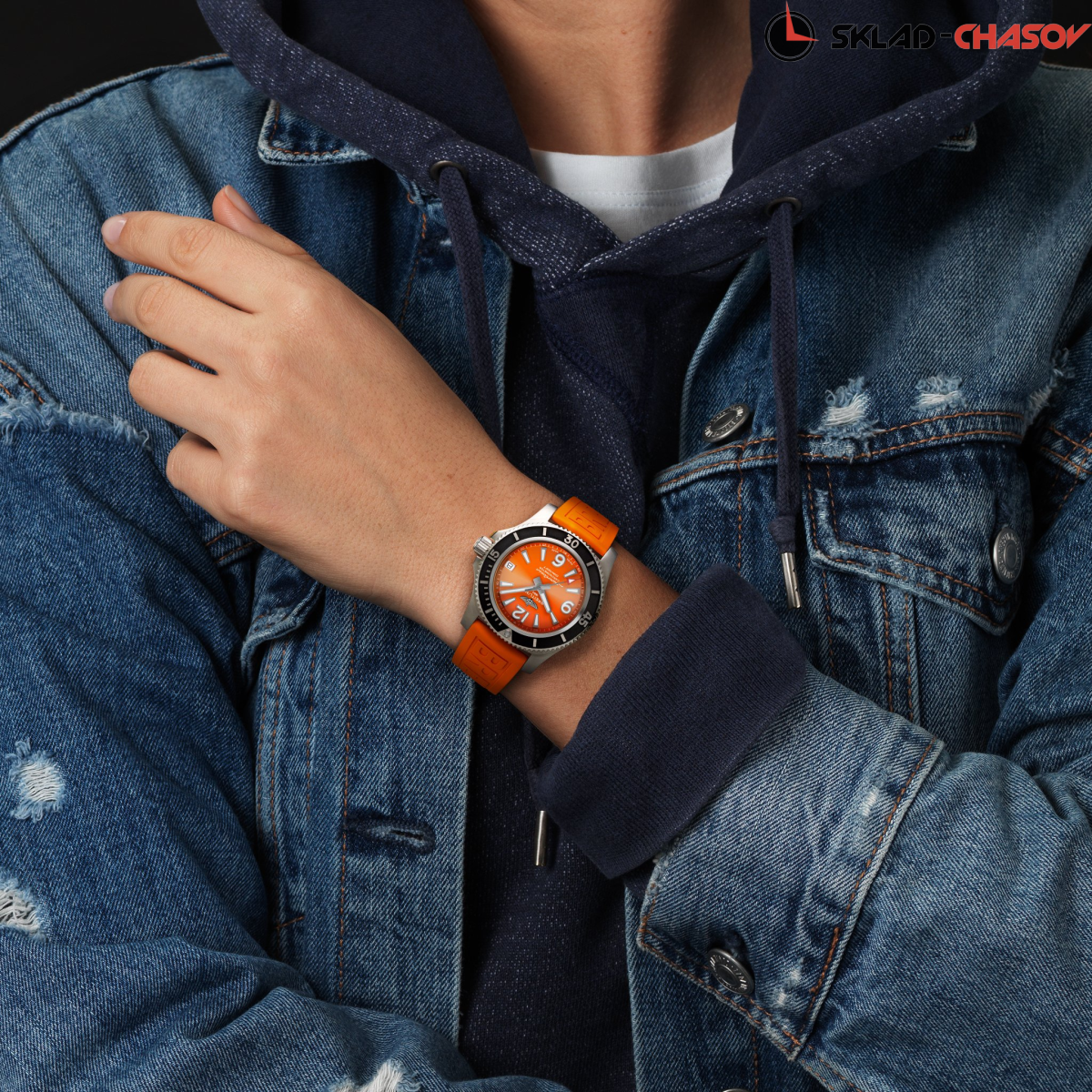 Яркая женская модель в оранжевом исполнении, вращающийся в одном направлении безель подчеркивает техничный, спортивный и оригинальный внешний вид.