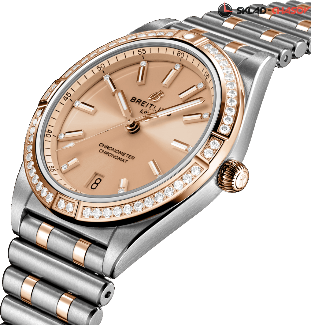 Выразительная и элегантная женская модель, механические с автоподзаводом, однонаправленный безель с культовыми вкладками. Секундная стрелка с логотипом на конце. Апертура даты в положении 6 часов. Хронометр C.O.S.C.