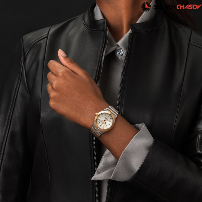 Выразительная и элегантная женская кварцевая модель. Секундная стрелка с логотипом на конце. Апертура даты в положении 6 часов. Хронометр C.O.S.C.