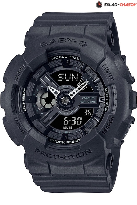 Противоударные кварцевые женские наручные часы Casio BA-110XBC-1A коллекции Baby-G с двойной индикацией времени. Калибр механизма — 5338. Функциональность данной модели: формат времени 12/24, мировое время 48 городов (29 часовых поясов), вечный календарь до 2099 года, функция летнего времени (DST), 5 независимых будильников, сигнал начала часа, секундомер с точностью 1/100 секунды и измерением до 23 часов 59 минут 59,99 cек., таймер обратного отсчета (диапазон времени 24 часа), диодная подсветка циферблата с функцией послесвечения, функция выключения звука нажатия кнопок (Mute). Водонепроницаемость WR100 (10 атм).