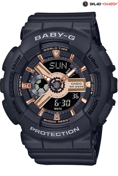 Противоударные кварцевые женские наручные часы Casio BA-110XRG-1A коллекции Baby-G с двойной индикацией времени. Калибр механизма — 5338. Функциональность данной модели: формат времени 12/24, мировое время 48 городов (29 часовых поясов), вечный календарь до 2099 года, функция летнего времени (DST), 5 независимых будильников, сигнал начала часа, секундомер с точностью 1/100 секунды и измерением до 23 часов 59 минут 59,99 cек., таймер обратного отсчета (диапазон времени 24 часа), диодная подсветка циферблата с функцией послесвечения, функция выключения звука нажатия кнопок (Mute). Стрелки покрыты необритовым (Neobrite) люминесцентным напылением (светятся в темноте). Водонепроницаемость WR100 (10 атм).