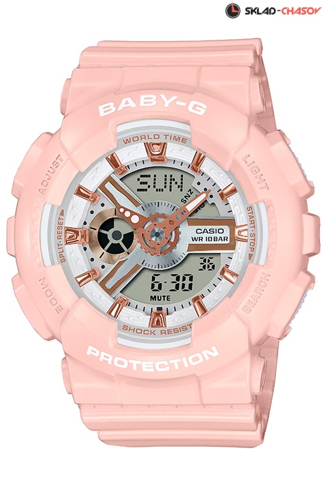 Противоударные кварцевые женские наручные часы Casio BA-110XRG-4A коллекции Baby-G с двойной индикацией времени. Калибр механизма — 5338. Функциональность данной модели: формат времени 12/24, мировое время 48 городов (29 часовых поясов), вечный календарь до 2099 года, функция летнего времени (DST), 5 независимых будильников, сигнал начала часа, секундомер с точностью 1/100 секунды и измерением до 23 часов 59 минут 59,99 cек., таймер обратного отсчета (диапазон времени 24 часа), диодная подсветка циферблата с функцией послесвечения, функция выключения звука нажатия кнопок (Mute). Стрелки покрыты необритовым (Neobrite) люминесцентным напылением (светятся в темноте). Водонепроницаемость WR100 (10 атм).