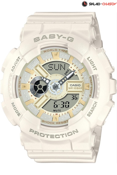 Противоударные кварцевые женские наручные часы Casio BA-110XSW-7A коллекции Baby-G с двойной индикацией времени. Калибр механизма — 5338. Функциональность данной модели: формат времени 12/24, мировое время 48 городов (29 часовых поясов), вечный календарь до 2099 года, функция летнего времени (DST), 5 независимых будильников, сигнал начала часа, секундомер с точностью 1/100 секунды и измерением до 23 часов 59 минут 59,99 cек., таймер обратного отсчета (диапазон времени 24 часа), диодная подсветка циферблата с функцией послесвечения, функция выключения звука нажатия кнопок (Mute). Стрелки покрыты необритовым (Neobrite) люминесцентным напылением (светятся в темноте). Водонепроницаемость WR100 (10 атм).