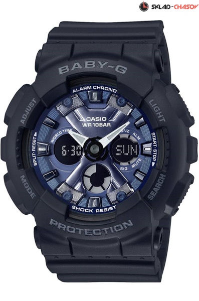 Противоударные кварцевые женские наручные часы Casio BA-130-1A2 коллекции Baby-G с двойной индикацией времени. Калибр механизма — 5607. Функциональность данной модели: формат времени 12/24, мировое время 48 городов (29 часовых поясов), вечный календарь до 2099 года, функция летнего времени (DST), 5 независимых будильников, сигнал начала часа, секундомер с точностью 1/100 секунды и измерением до 23 часов 59 минут 59,99 cек., таймер обратного отсчета (диапазон времени 24 часа), диодная подсветка циферблата, функция перемещения стрелок (помогает определить значения в окошках с цифровой индикацией, когда стрелки их закрывают), функция выключения звука кнопок (Mute). Водонепроницаемость WR100 (10 атм).