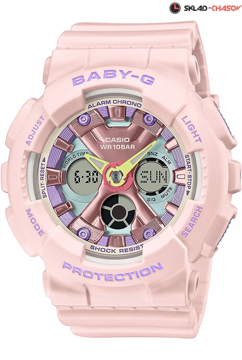 Противоударные кварцевые женские наручные часы Casio BA-130PM-4A коллекции Baby-G с двойной индикацией времени. Калибр механизма — 5607. Функциональность данной модели: формат времени 12/24, мировое время 48 городов (29 часовых поясов), вечный календарь до 2099 года, функция летнего времени (DST), 5 независимых будильников, сигнал начала часа, секундомер с точностью 1/100 секунды и измерением до 23 часов 59 минут 59,99 cек., таймер обратного отсчета (диапазон времени 24 часа), диодная подсветка циферблата с функцией послесвечения, функция выключения звука нажатия кнопок (Mute). Стрелки покрыты необритовым (Neobrite) люминесцентным напылением (светятся в темноте). Водонепроницаемость WR100 (10 атм).