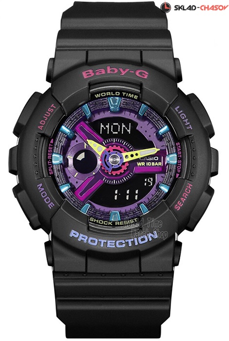 Противоударные кварцевые женские наручные часы Casio BA-112-1A коллекции Baby-G с двойной индикацией времени. Калибр механизма — 5338. Функциональность данной модели: формат времени 12/24, мировое время 48 городов (29 часовых поясов), вечный календарь до 2099 года, функция летнего времени (DST), 5 независимых будильников, сигнал начала часа, секундомер с точностью 1/100 секунды и измерением до 23 часов 59 минут 59,99 cек., таймер обратного отсчета (диапазон времени 24 часа), диодная подсветка циферблата с функцией послесвечения, функция выключения звука нажатия кнопок (Mute). Стрелки покрыты необритовым (Neobrite) люминесцентным напылением (светятся в темноте). Водонепроницаемость WR100 (10 атм).