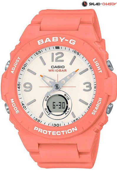 Противоударные кварцевые женские наручные часы Casio BGA-260-4A коллекции Baby-G с двойной индикацией времени. Калибр механизма — 5628. Функциональность данной модели: формат времени 12/24, функция мирового времени, вечный календарь до 2099 года, функция летнего времени (DST), 5 будильников, сигнал начала часа, секундомер с измерением до 59 минут 59 cек., таймер обратного отсчета (диапазон времени 1 час), диодная подсветка циферблата. Водонепроницаемость WR100 (10 атм).