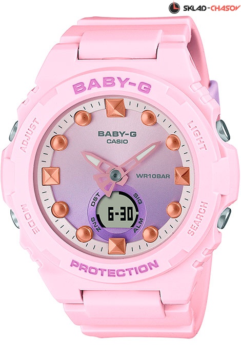 Противоударные кварцевые женские наручные часы Casio BGA-320-4A коллекции Baby-G с двойной индикацией времени. Калибр механизма — 5628. Функциональность данной модели: формат времени 12/24, мировое время в 27 городах (29 часовых поясах), вечный календарь до 2099 года, функция летнего времени (DST), 5 будильников, сигнал начала часа, секундомер с измерением до 59 минут 59 cек., таймер обратного отсчета (диапазон времени 1 час), диодная подсветка циферблата с возможность выбора времени свечения (1.5 или 3 секунды). Стрелки покрыты необритовым (Neobrite) люминесцентным напылением (светятся в темноте). Водонепроницаемость WR100 (10 атм).