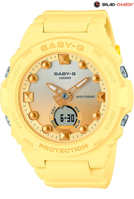 Противоударные кварцевые женские наручные часы Casio BGA-320-9A коллекции Baby-G с двойной индикацией времени. Калибр механизма — 5628. Функциональность данной модели: формат времени 12/24, мировое время в 27 городах (29 часовых поясах), вечный календарь до 2099 года, функция летнего времени (DST), 5 будильников, сигнал начала часа, секундомер с измерением до 59 минут 59 cек., таймер обратного отсчета (диапазон времени 1 час), диодная подсветка циферблата с возможность выбора времени свечения (1.5 или 3 секунды). Стрелки покрыты необритовым (Neobrite) люминесцентным напылением (светятся в темноте). Водонепроницаемость WR100 (10 атм).