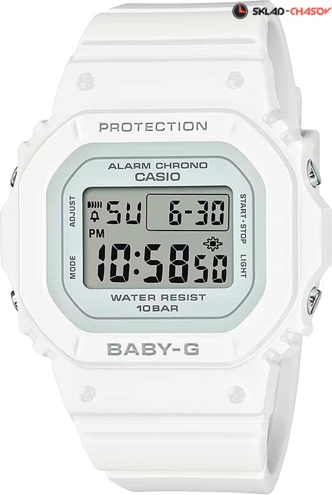 Противоударные кварцевые женские наручные часы Casio BGD-565-7 коллекции Baby-G с цифровой индикацией времени. Калибр механизма — 3489. Функциональность данной модели: формат времени 12/24, вечный календарь до 2099 года, функция летнего времени (DST), будильник, сигнал начала часа, секундомер с точностью 1/100 секунды и измерением до 59 минут 59,99 cек., таймер обратного отсчета (диапазон времени 24 часа), электролюминесцентная подсветка циферблата с функцией послесвечения. Водонепроницаемость WR100 (10 атм).