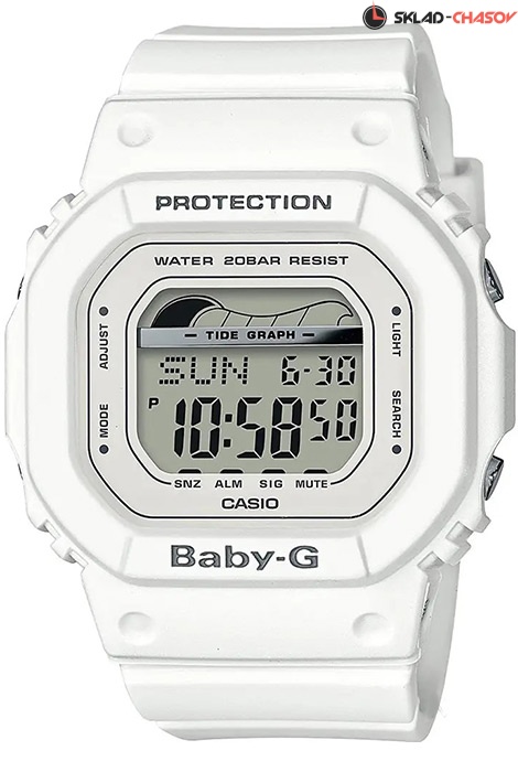 Противоударные кварцевые женские наручные часы Casio BLX-560-7 коллекции Baby-G с цифровой индикацией времени. Калибр механизма — 3296. Функциональность данной модели: формат времени 12/24, мировое время 48 городов (29 часовых поясов), вечный календарь до 2099 года, функция летнего времени (DST), возраст/фаза луны для определенной даты, график приливов для определенной даты/времени, 3 многофункциональных будильника, сигнал начала часа, секундомер с точностью 1/100 секунды и измерением до 23 часов 59 минут 59,99 cек., таймер обратного отсчета (диапазон времени 24 часа), электролюминесцентная подсветка циферблата, функция выключения звука кнопок (Mute), Водонепроницаемость WR200 (20 атм).