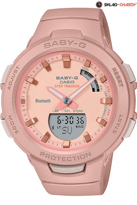 Противоударные кварцевые женские наручные часы Casio BSA-B100CS-4A коллекции Baby-G с функцией шагомера и технологией Bluetooth®. Калибр механизма — 5556. С помощью Bluetooth® вы можете подключить часы к смартфону и с помощью приложения BABY-G Connected получить доступ к полезным функциям. Часы автоматически связываются с телефоном через Bluetooth® и проверяют точность времени 4 раза в сутки. Просмотр количества шагов за 24 часа, интенсивность упражнений и физических нагрузок. Просмотр еженедельного количества шагов и числа сожженных калорий. Просмотр информации секундомера о времени прохождения кругов или промежуточных результатах (до 200 записей). Настройка программируемых таймеров и создание групп из нескольких таймеров. Настройка мирового времени. Функция поиска телефона, можно включить тоновый сигнал на телефоне, что позволит быстро найти телефон. Функциональность данной модели: формат времени 12/24, вечный календарь до 2099 года, функция летнего времени (DST), функция двойного времени, 5 независимых будильников, сигнал начала часа, секундомер с измерением до 23 часов 59 минут 59 cек. и записью данных (до 200 записей), 5 независимых таймеров обратного отсчета (диапазон времени 60 минут), двойная диодная подсветка циферблата с функцией авто (включается при наклоне часов на 40°) и регулировкой времени подсветки 1,5 или 3 секунды + необритовое (Neobrite) покрытие на стрелках для длительного послесвечения в темноте, режим выключения звука нажатия кнопок (Mute), функция смещения стрелок для удобного просмотра информации на цифровом экране. Подсчет количества шагов с помощью 3-х осевого аксилометра. Напоминание о активности: Информирует Вас о том, что количество шагов слишком мало, с помощью дисплея и звукового сигнала. График количества шагов: почасовое количество шагов за последние 11 часов на 6-уровневом графике Индикатор количества шагов. Режим энергосбережения: Автоматический переход датчика в режим ожидания после фиксированного периода бездействия. Диапазон подсчета и отображения количества шагов: от 0 до 999 999. Водонепроницаемость WR100 (10 атм).