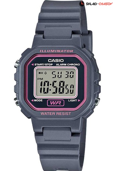 Электронные кварцевые женские наручные часы Casio LA-20WH-8A с цифровой индикацией времени. Калибр механизма — 3284. Функциональность данной модели: формат времени 12/24, вечный календарь до 2099 года, будильник, сигнал начала часа, секундомер с точностью 1/100 секунды и измерением до 59 минут 59,99 cек., диодная подсветка циферблата.
