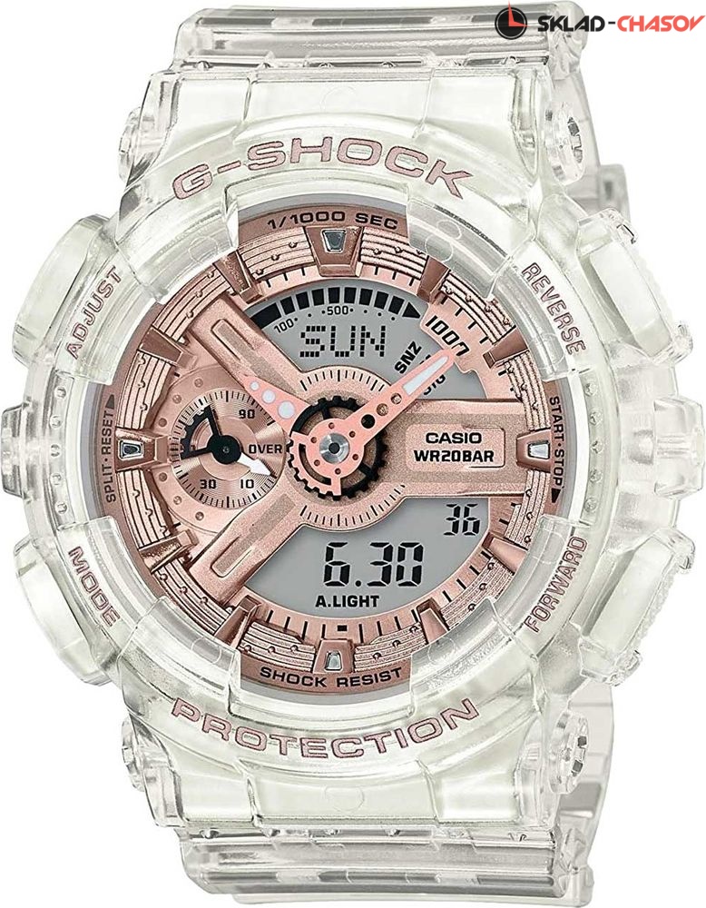 Модель GMA-S110 из женской серии S-Series в прозрачном корпусе. 12-ти и 24-х часовой формат времени. Циферблат подсвечивается светодиодом, функция автоподсветки освещает циферблат при повороте часов к лицу. Ударопрочная конструкция защищает механизм от ударов и вибрации. Секундомер с точностью показаний 1/1000 сек. и временем измерения 100 ч. Сплит-хронограф. Таймер обратного отсчета от 1 мин. до 24 ч. с автоповтором. Мировое время. 5 будильников, один с функцией Snooze (повтор сигнала). Ежечасный сигнал. Вес 56 грамма. Гарантия 2 года.