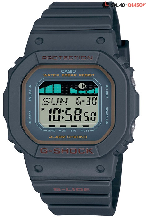 Женские противоударные кварцевые наручные часы Casio GLX-S5600-1 коллекции G-Shock с графиком приливов и фазой луны. Калибр механизма — 3559. Функциональность данной модели: формат времени 12/24, вечный календарь до 2099 года, функция летнего времени (DST), мировое время 48 городов (29 часовых поясов), 3 независимых будильников, сигнал начала часа, секундомер с точностью 1/100 секунды и измерением до 23 часов 59 минут 59,99 cек., таймер обратного отсчета (диапазон времени 24 часа), возраст/фаза луны для определенной даты, график приливов для определенной даты/времени, диодная подсветка циферблата (Super Illuminator) с возможностью выбора времени свечения (1.5 или 3 секунды), функция выключения звука нажатия кнопок (Mute). Водонепроницаемость WR200 (20 атм).