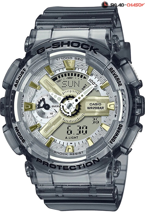 Противоударные кварцевые наручные часы Casio GMA-S110GS-8A коллекции G-Shock цифровой+стрелочной индикацией времени. Калибр механизма — 5425. Функциональность данной модели: формат времени 12/24, вечный календарь до 2099 года, функция летнего времени (DST), мировое время 48 городов (29 часовых поясов), 5 независимых будильников, сигнал начала часа, секундомер с точностью 1/1000 секунды и измерением до 99 часов 59 минут 59,99 cек., функция расчета средней скорости движения, таймер обратного отсчета (диапазон времени 24 часа), диодная подсветка циферблата с функцией авто (включается при наклоне часов на 40°) и возможностью выбора времени свечения (1.5 или 3 секунды) + необритовое (Neobrite) покрытие на стрелках и метках для длительного послесвечения в темноте. Водонепроницаемость WR200 (20 атм).